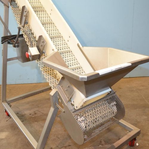 12 in W Plastic Interlocking Chian Cleated Incline Conveyor. 67 in Discharge Height, 1 in High Flights, 8 in on Center, 6 in H Poly Side Rails, 71 in L Incline Section, 24 in W x 14 in D S/S Hopper, S/S Frame with Catsers For Portability. 1/3 HP Motor, 115/230 V (wired 115V), 1 Ph, 60 Hz, 1725 RPM, 1/115/230/60, 6.8/3.4 Amps