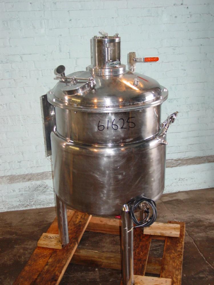 70 Gallon S/S Electric Oil Jacket Turbine Agitated Tank, 304 S/S. Approx Inside Dims: 27 in Dia x 27 in Str Side, S/S turbines, (2) Side Baffles, Top Inlets: 7 1/2 in Dia w/ Cover, 1 in, 1 1/2 in threaded. 2 in Flanged CBO, (3) 24 in S/S legs, 16 in Discharge Ht., Bolt On Dome Top, Dish Bottom