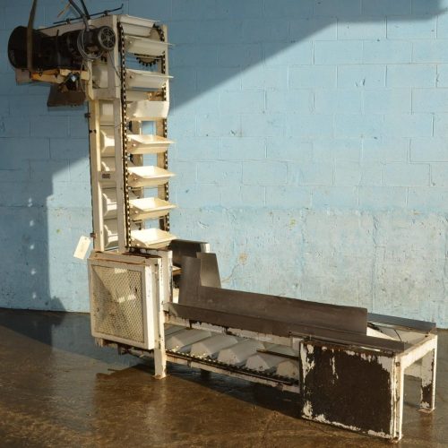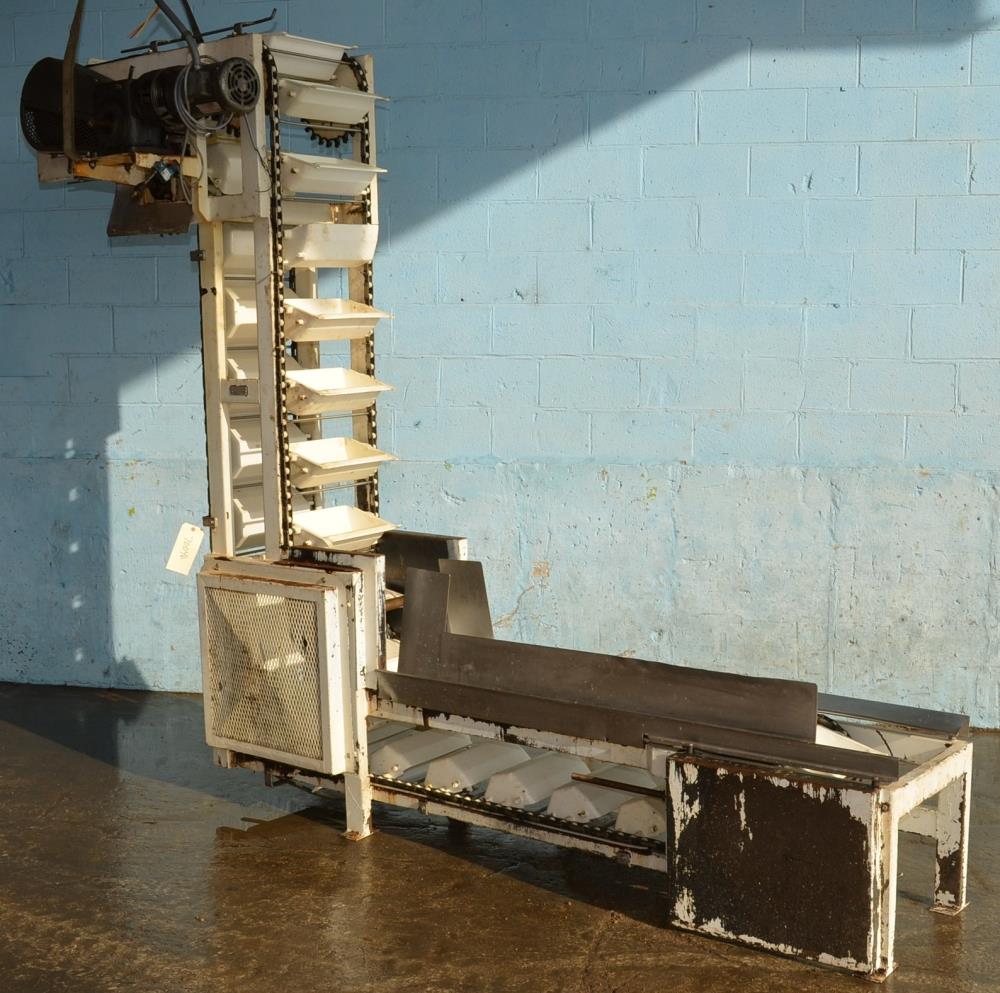 7.5 ft discharge Height 11 3/4 in x 7.5 in plastic Bucket Elevator w/ C/S frame, Approx. 63 in L Infeed Section, Approx. 78 in Vertical Section, Approx. 26 in L Discharge Section with 11 3/4 in x 7 1/2 in x 4 in Poly Buckets. Approx Discharge Height 91 in.
