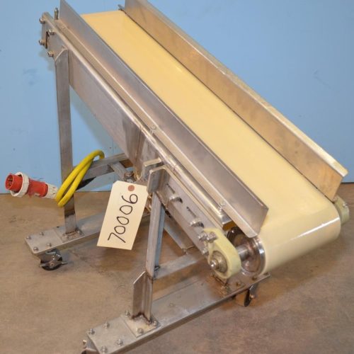 8 in W x 36 in L Powered Portable Incline Vinyl Belt Conveyor with S/S Frame and (4) Casters. 22 in High on Low End, 32 in H on High End. 1/2 HP Drive Motor, 208-230/460V, 3 Ph, 60 Hz, Last Used For Cheese in a USDA Facility.