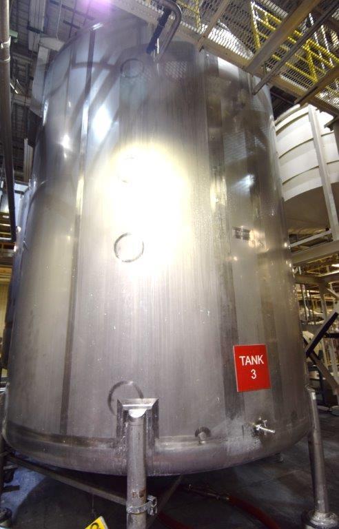 8,000 Gallon (approx.) Northland Vertical 316 S/S Single Wall Agitated Tank. Approximate 126 in diameter x 144 in straight side. Dished top and bottom. Stainless steel agitator bridge with a Lightnin model 74Q7.5 agitator, approximate 7.5 hp XP motor, serial # 8732987002. 4 Sidewall baffles, spray ball and internal sidewall ladder. Top manway, approximate 3 in center bottom outlet. Mounted on 6 stainless steel legs. Serial# 873776-3, built 1987.