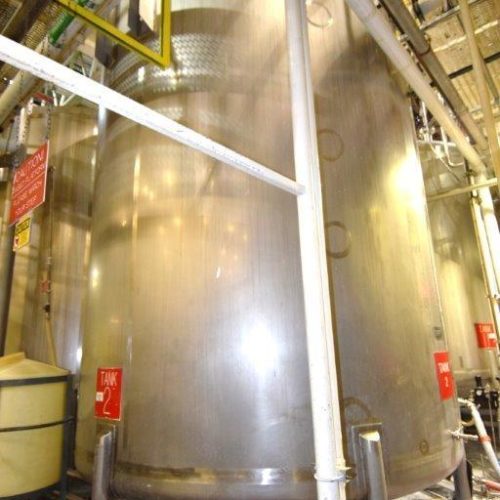 8,000 Gallon (approx.) Northland Vertical 316 S/S Single Wall Agitated Tank. Approximate 126 in diameter x 144 in straight side. Dished top and bottom. Stainless steel agitator bridge with a Lightnin model 74Q7.5 agitator, approximate 7.5 HP XP motor, serial # 8732986901. 4 sidewall baffles, spray ball and internal sidewall ladder. Top manway, approximate 3 in center bottom outlet. Mounted on 6 stainless steel legs.