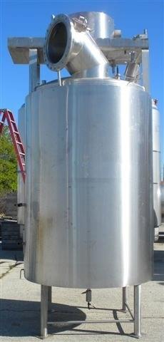 850 Gallon Lee Model 850U9MS Double Motion Vacuum Processor. 316 Stainless Steel, Vertical. 66 in diameter x 89 in straight side. Dished top and bottom. #4 Internal finish non-code rated for F.V./15 psi at -20 to 250 deg.f. National Bd # 4504, 304 Stainless steel Uniflow coil jacket rated 125 psi at 353 degrees F. Minimum design metal temperature -20 degrees F at 125 psi. 1-1/2in Thick fiberglass insulation with 304 stainless steel sheathing, fixed stainless steel agitator bridge. Dual motion agitator, anchor style with scrapers, inner bar type agitator, driven by a 25hp, 3/60/230/460 volt motor thru a Lee heavy duty DM3 gear box, output 25.75 rpm, maximum product viscosity 750,000 CPS. Top entering spray ball. Openings top 1in, (2) 1-1/2in tri-clamp, (2) 2in tri-clamp, (2) 3in sightglass, 3-1/2in drive, 18in manway with cover. 4in tri-clamp center bottom outlet. Mounted on 4 stainless steel legs, approximate 18in discharge height.