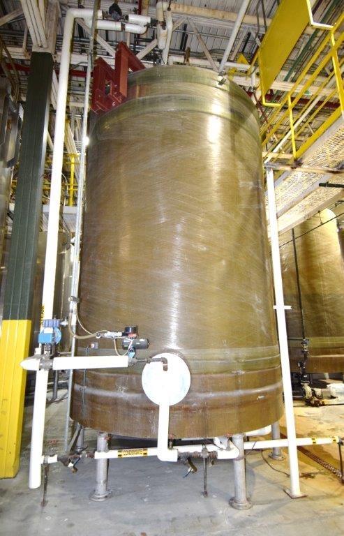 8,535 Gallon (approx.) Warner Fiberglass Products Model CCDV108535 Vertical Fiberglass Tank. Derakane 411-45 Fiberglass Resin. Approximate 120 in diameter x 168 in straight side. Slight dished top, dished bottom. Carbon steel agitator bridge with a Lightnin Model 92Q3 3-blade turbine agitator with S/S shaft, serial # 9155724301, approximate 3 HP XP motor. 3 sidewall baffles. Top manway, approximate 4 in center bottom outlet. Mounted on 6 stainless steel legs.