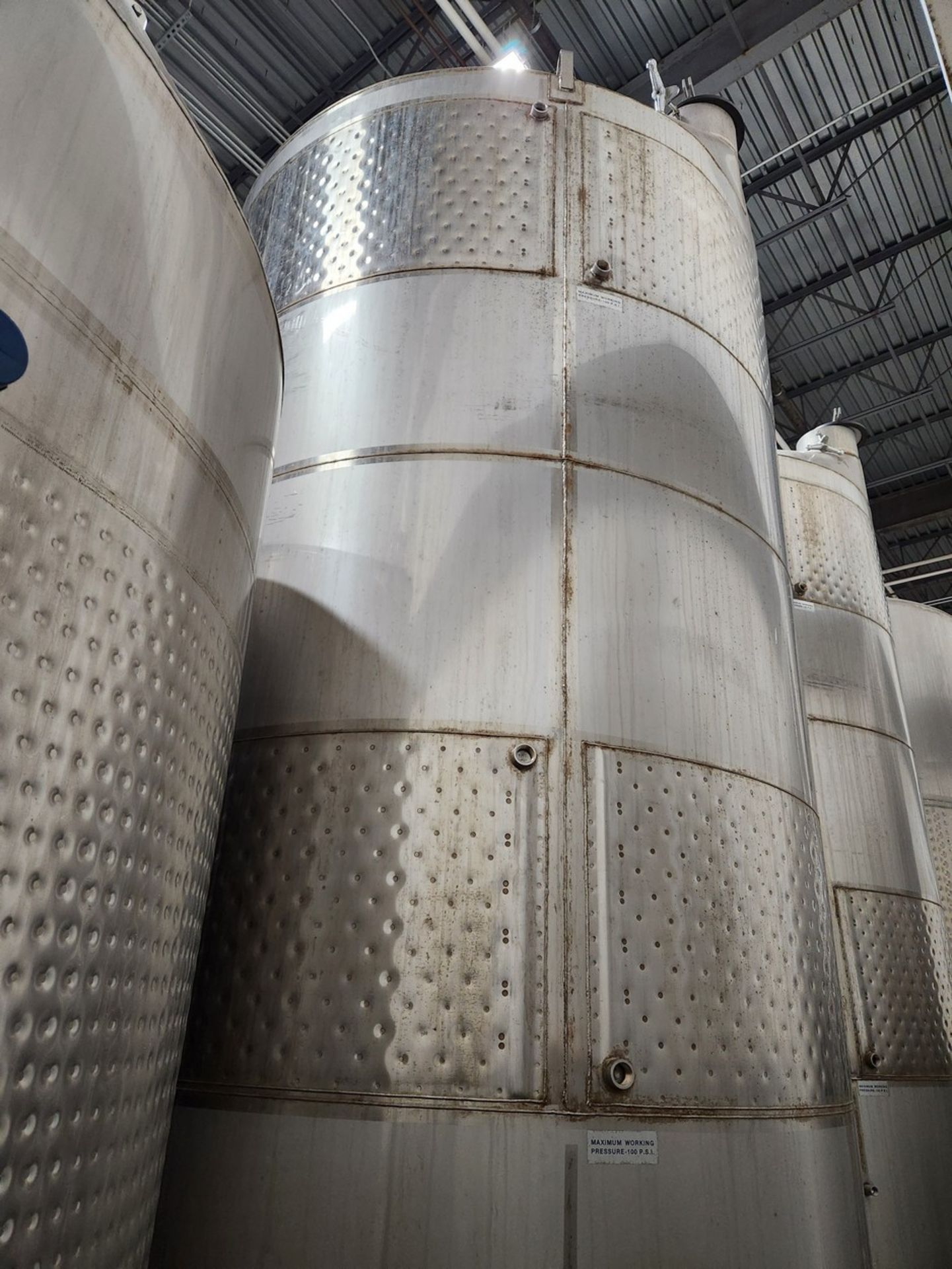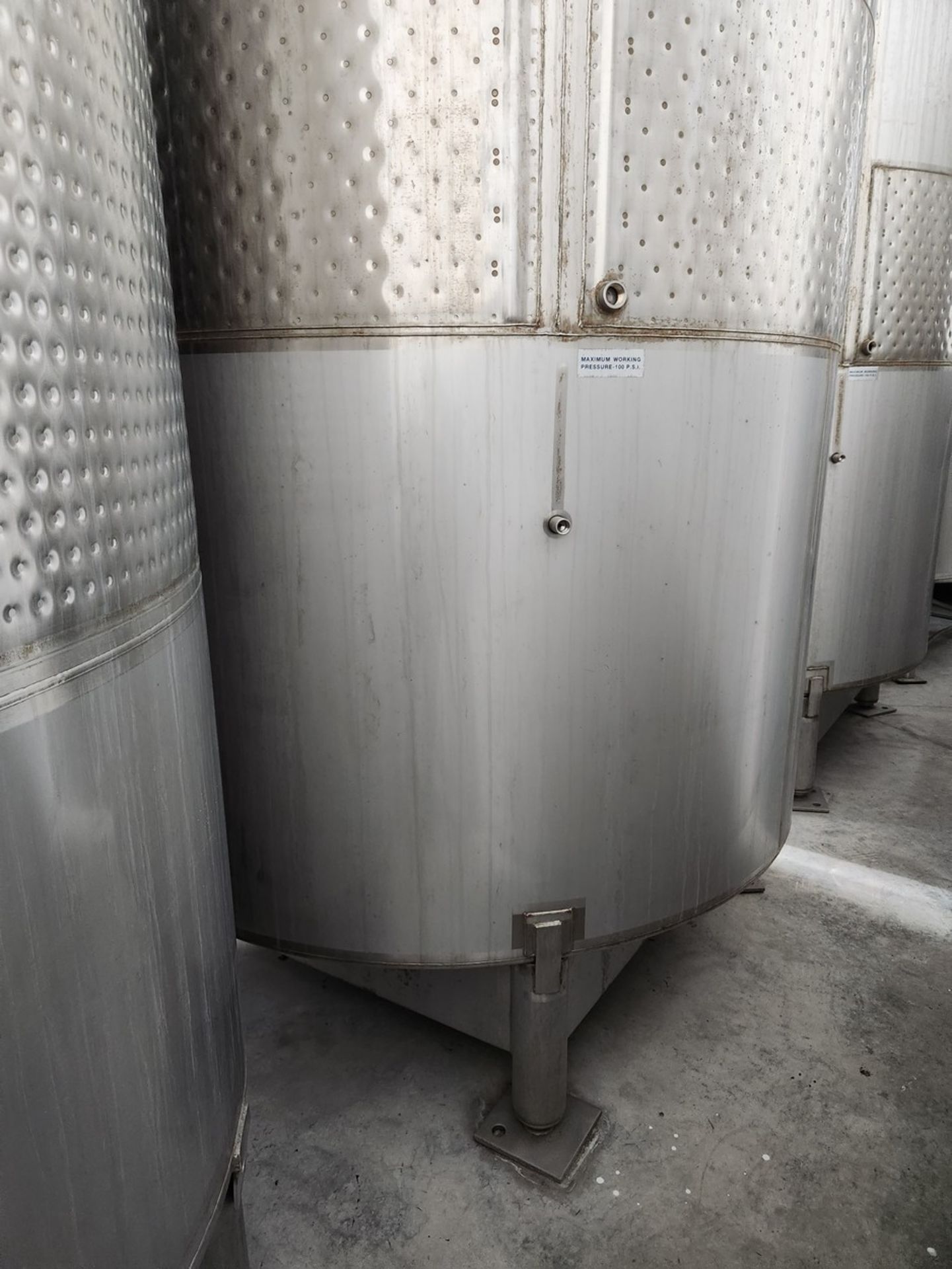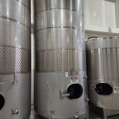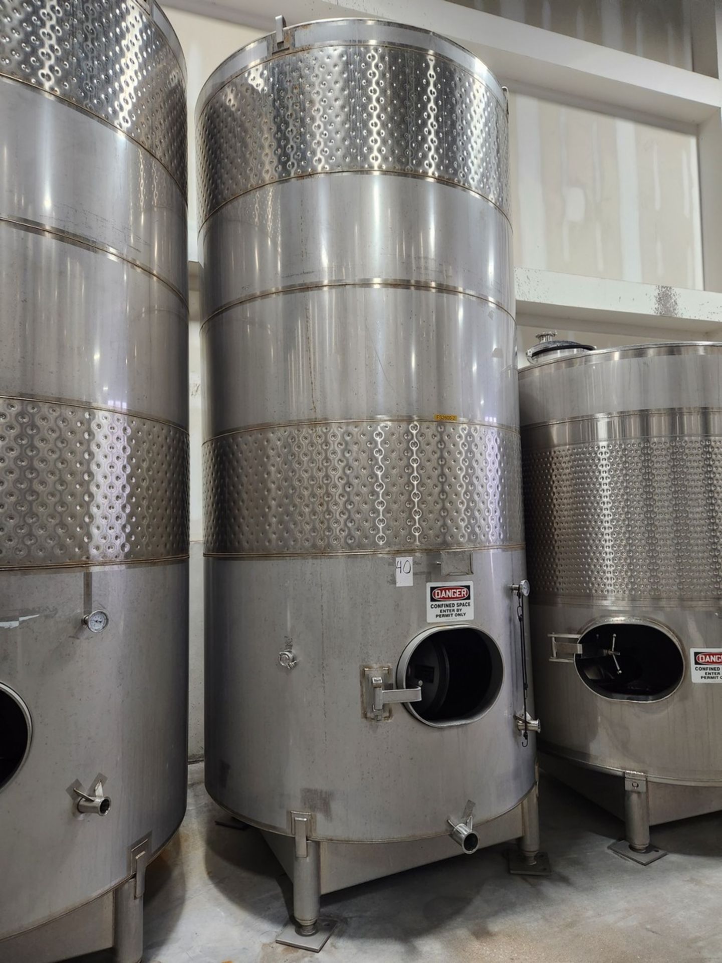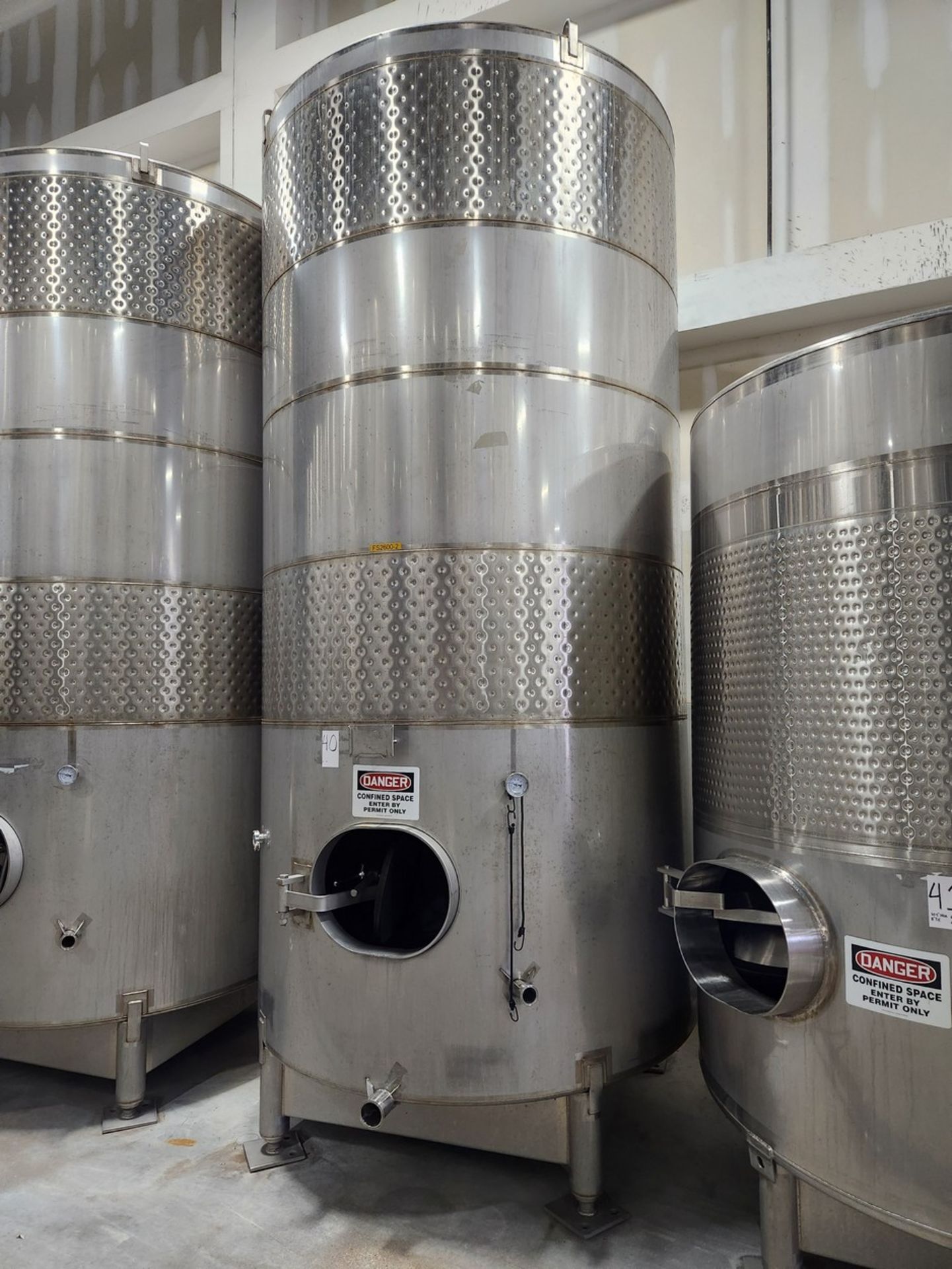 90bbl (2,790 Gallon) Santa Rosa Stainless Steel Stainless Steel Beverage Tank Jacketed, Top Mounted Overflow, Flat Bottom, Front Access Hatch, Adjustable Legs, Tank Is Not Bolted To Floor, Tank Dimensions 70 In. x 70 In. x 11 Ft.; All measurements are approximate.
