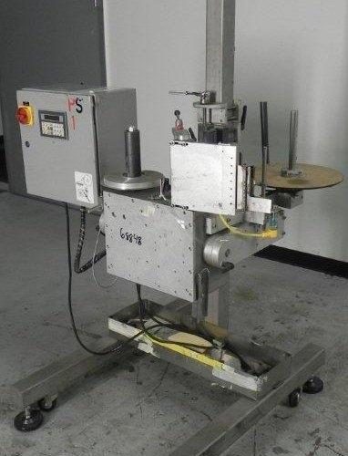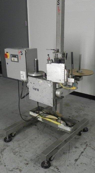 Accraply Model 350PED Pressure Sensitive Labeler with (1) 14 in Diameter Reel with 1 in Diameter Core, (1) 9 in Diameter Reel with 2 in Diameter Core, with Digital Touch Pad Controls, Mounted on Portable S/S T Stand, 120V, 1Ph, 60Hz, 10 Amp