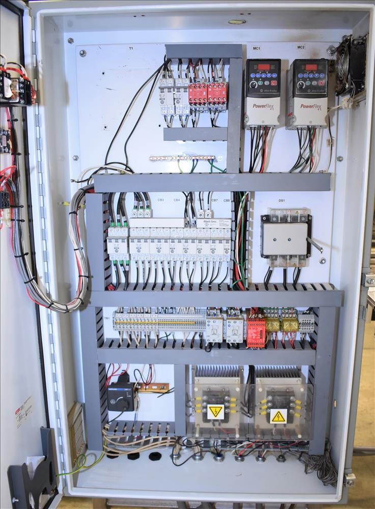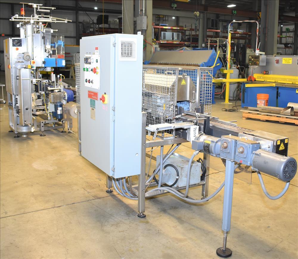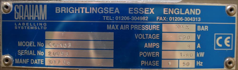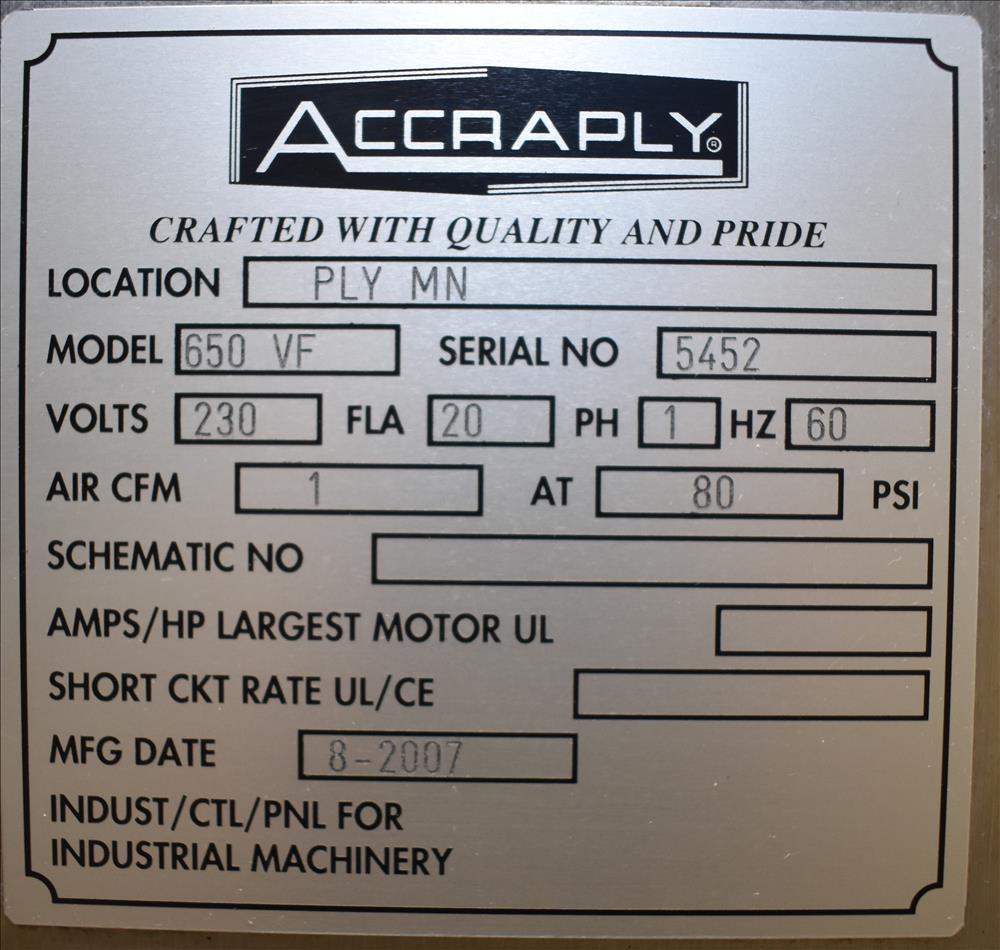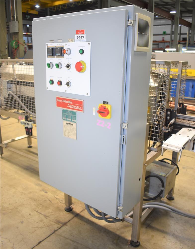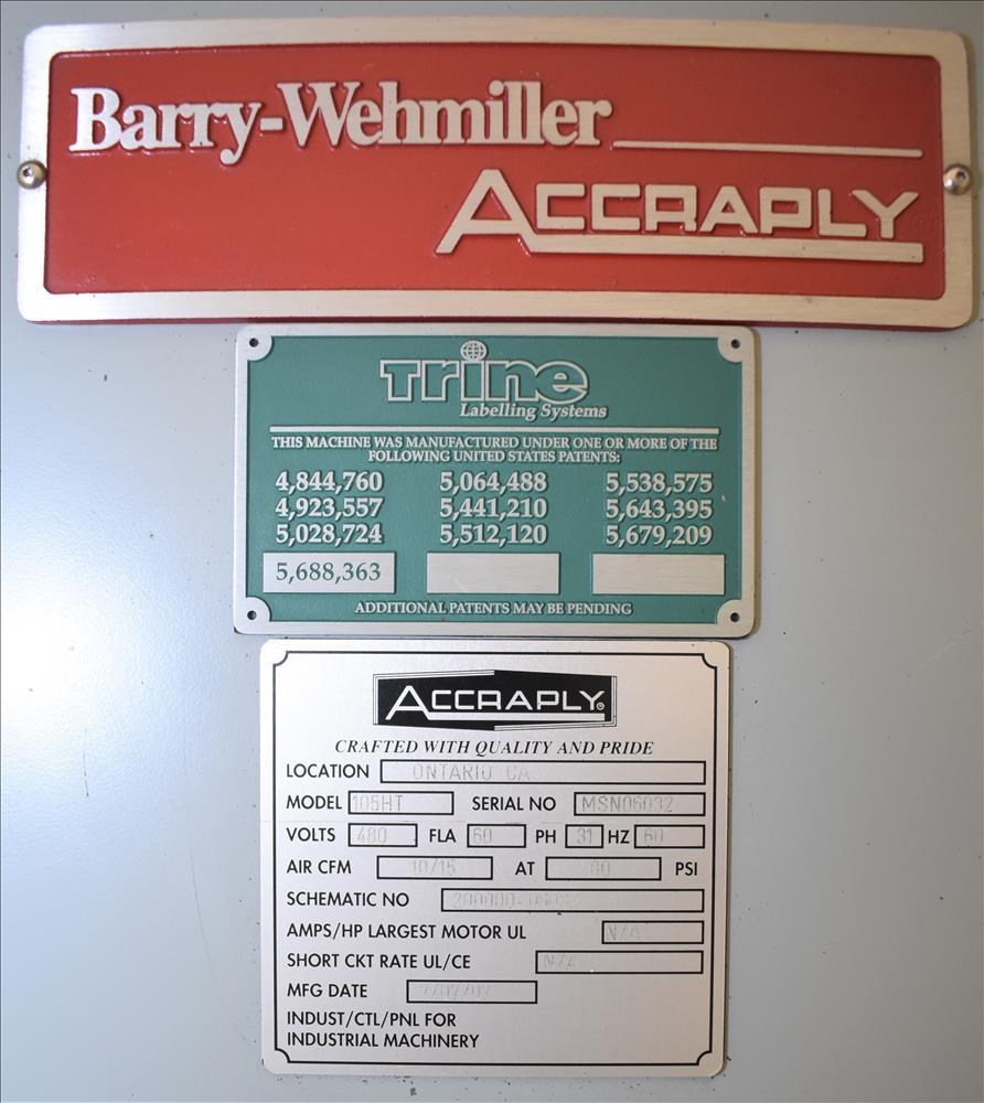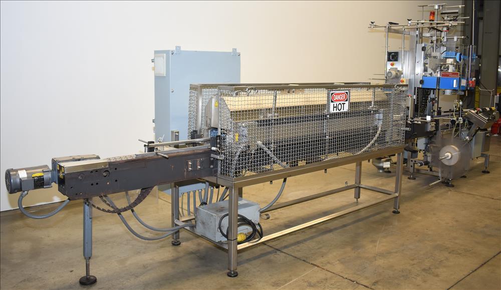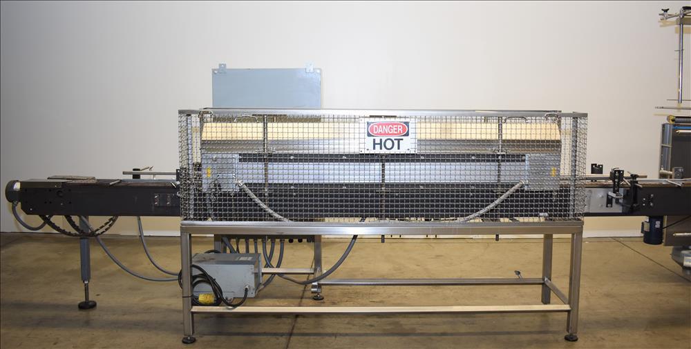 Accraply (Graham “Sleevit”) Model 650VF High Speed Shrink Sleeve Label Applicator and Heat Shrink Tunnel. Capable of speeds up to 650 Containers per minute (depending on application). Container size range: 1.1 in – 6.6 in or 28mm – 170mm (diameter) x 1.1 in – 11.8 in or 30mm – 300mm (height). Material types: PVC, PET/PETG, OPS, PLA. Allen Bradley Micrologix1000 PLC with a Proface HMI. Toshiba Powerflex 4 and Panasonic Servo Drives. Has print registration. Includes a 480V Electric Shrink Tunnel, Model 105HT. Serial # MSN06032. Tunnel has 6 in wide x 6 in high opening. Conveyor is 127 in long x 4-1/2 in wide table-top chain. 3/60/230V Sleever, 3/60/480V, 60 Amp Tunnel. Serial # 5452.