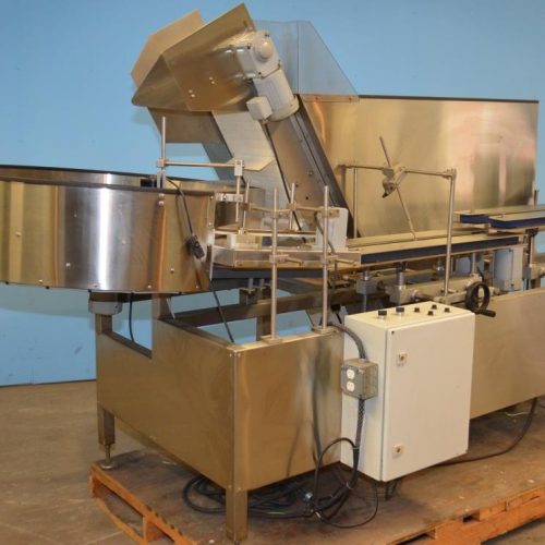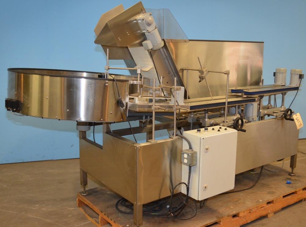 Accutek AccuSort 100, Model 50B0A000 Stainless Steel Automatic Bottle Unscrambler Orientator. Capable of Speeds Up To 250 CPM, System Easily Handles Containers From 1 oz to 1 Gallon Including Round, Square, Rectangular, Oval, Tapered, F Style. Containers Are Loaded Into Bulk Hopper Then Distributed Into Rotary Pre-Feeder Bowl Automatically and On Demand. The Pre-Feeder Rotates The Containers Single File Into The Orientator That Stands The Containers Upright Onto The Conveyor, 58 in L x 34 1/2 in W x 46 in D S/S Bulk Supply Hopper. 12 in W Plastic Interlocking Chain Flighted Conveyor with 3 in H Flights and 12 in Centers. 47 1/2 in Inside Diameter Rotary Pre-Feeder Bowl. 31 in L Orientator Conveyor Section, 35 in Long Conveyor Section with 1 1/4 in W Carry Belts and Adjustable Width. . . 110 V, 1 Ph, 60 Hz.