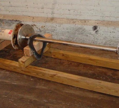 15 hp Admix Mdl 160RS133 high speed shear mixer, 5 ft L x 2 1/2 in dia 304 S/S Shaft w/ (4) blade bolt on turbine prop and 5 in dia rotosolver welded mixing head, 15 HP 3/60/230/460 1760 RPM , 14 in Dia (4) bolt flange for tank mounting, 39 in tall above flange mount, 100 % homogeneity within a viscosity range up to 25,000 CPS, disperse deagglomerate and provide uniform emulsion droplets down to 3 microns or less.