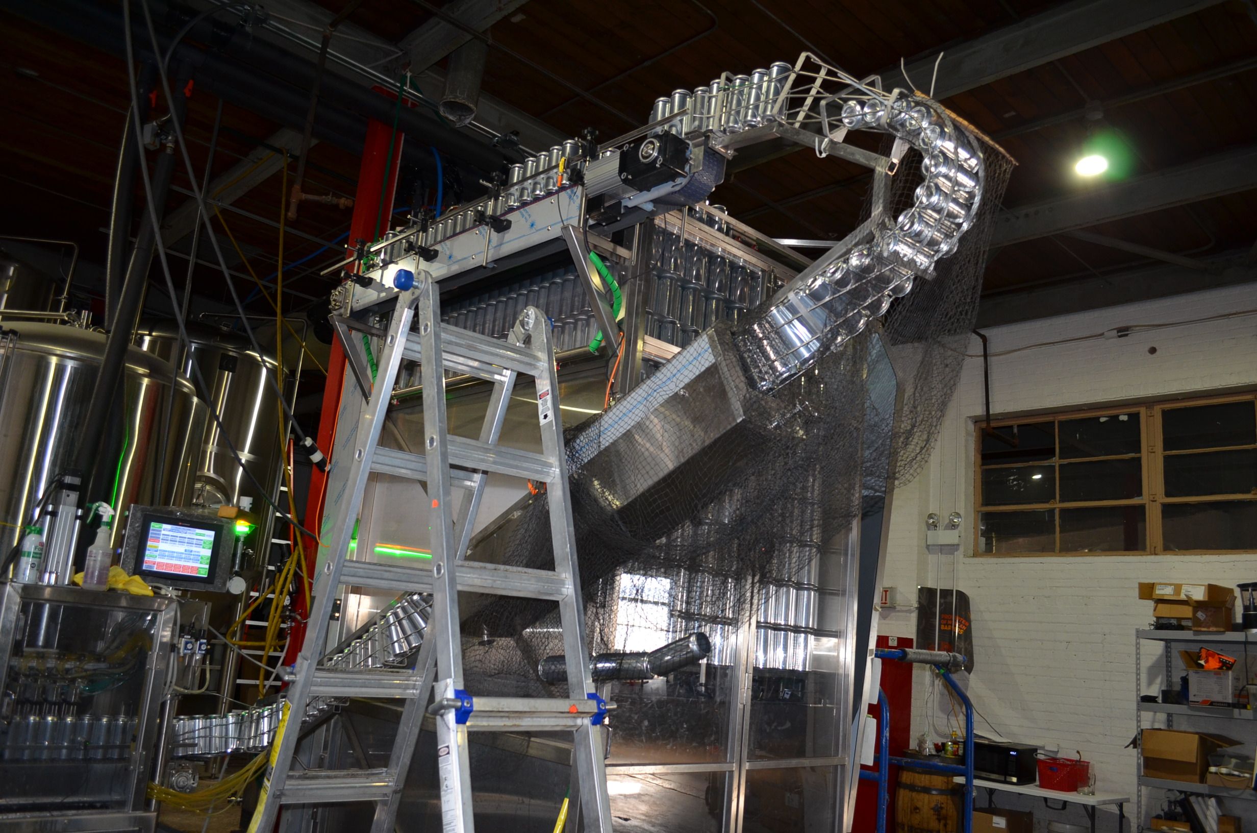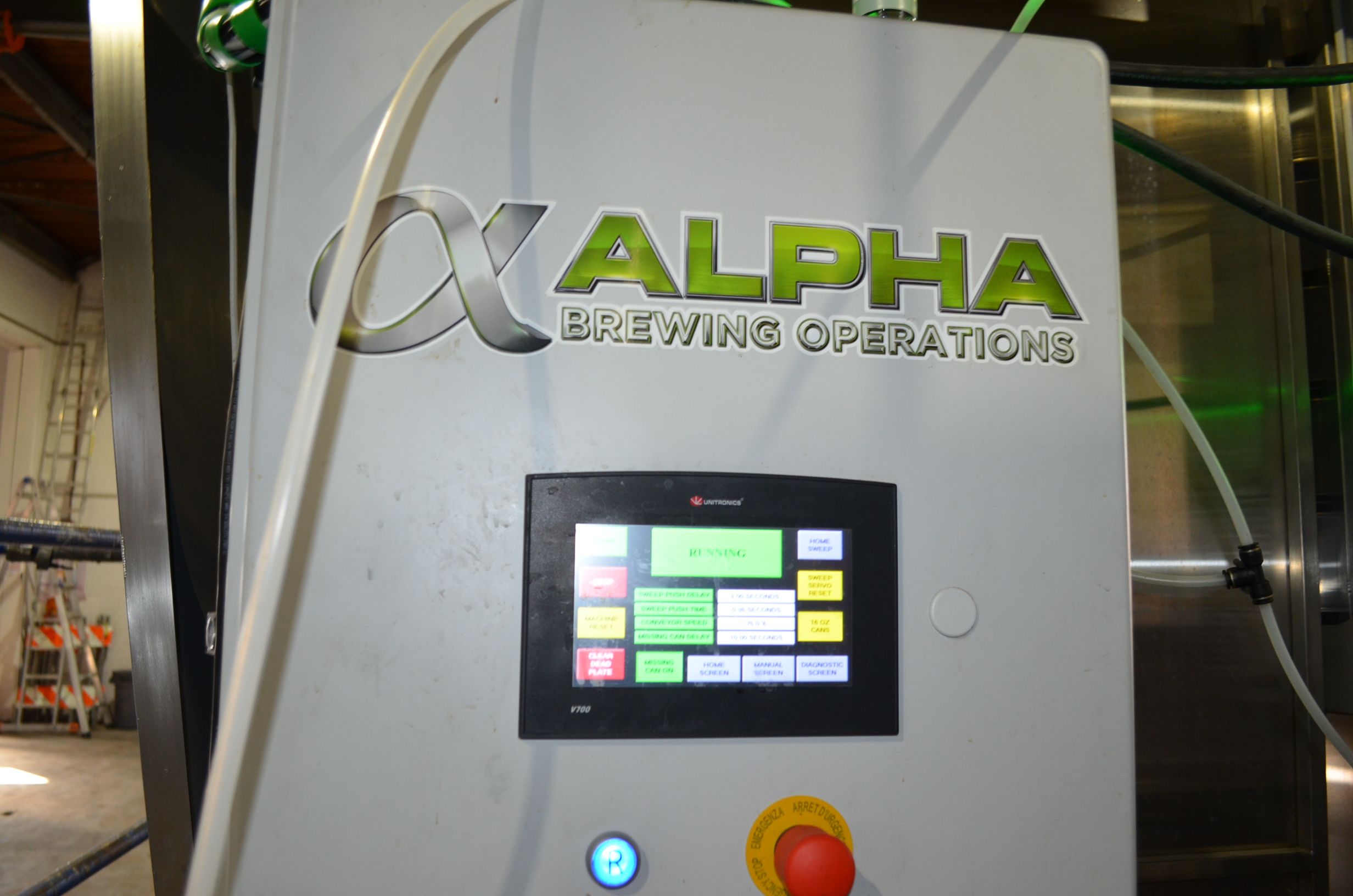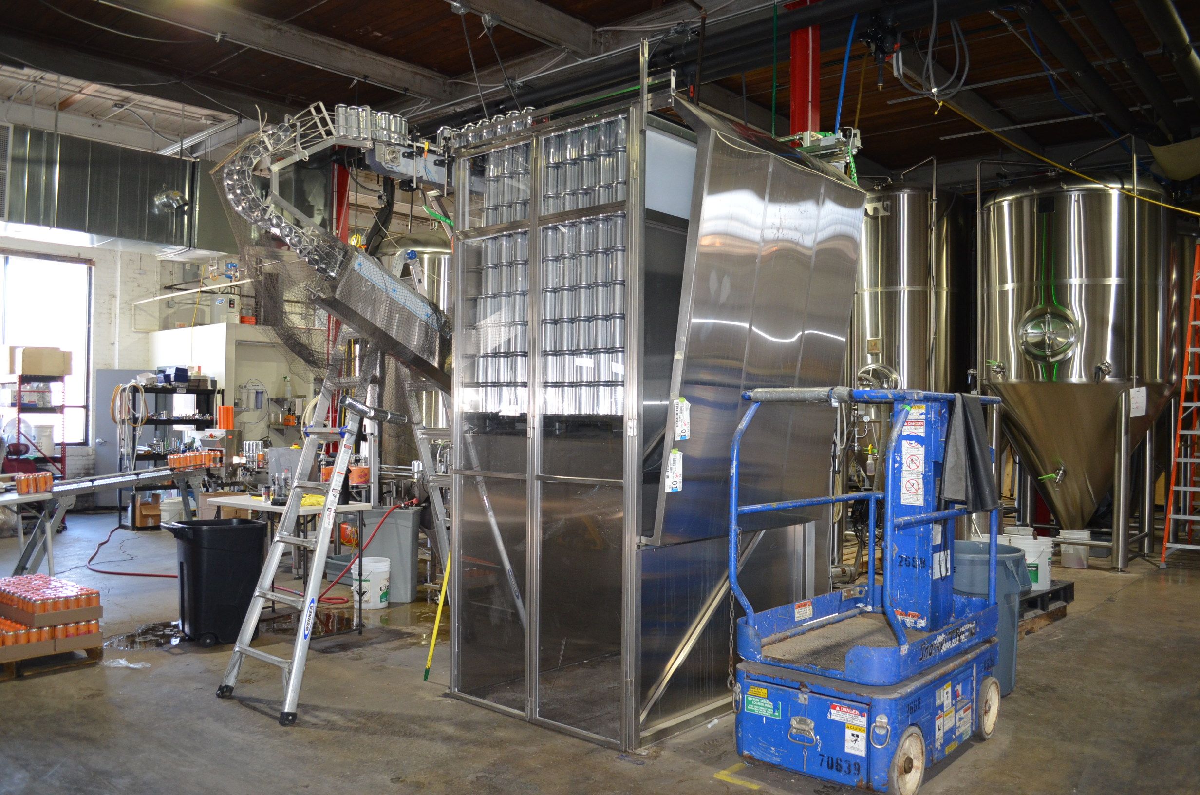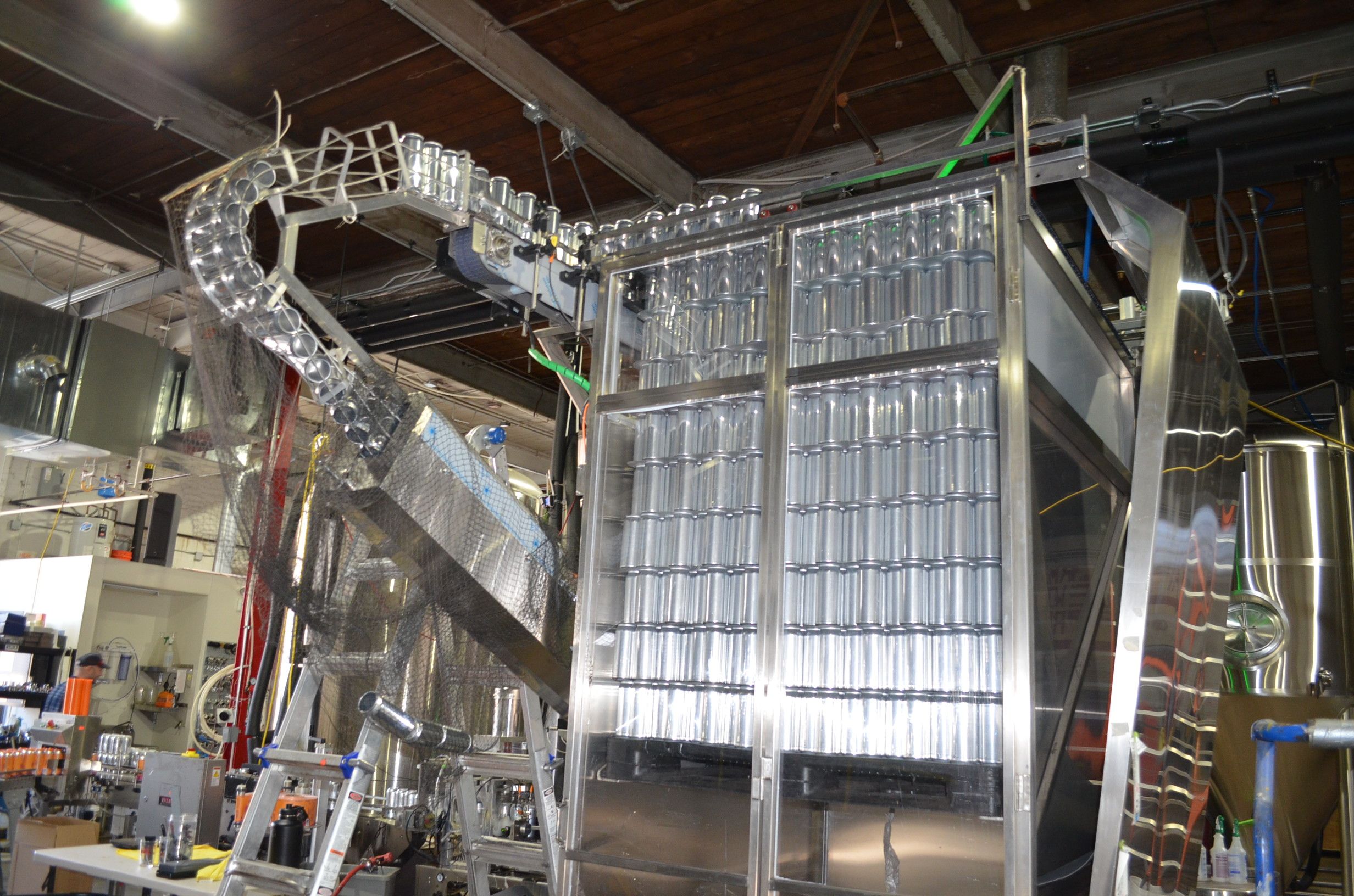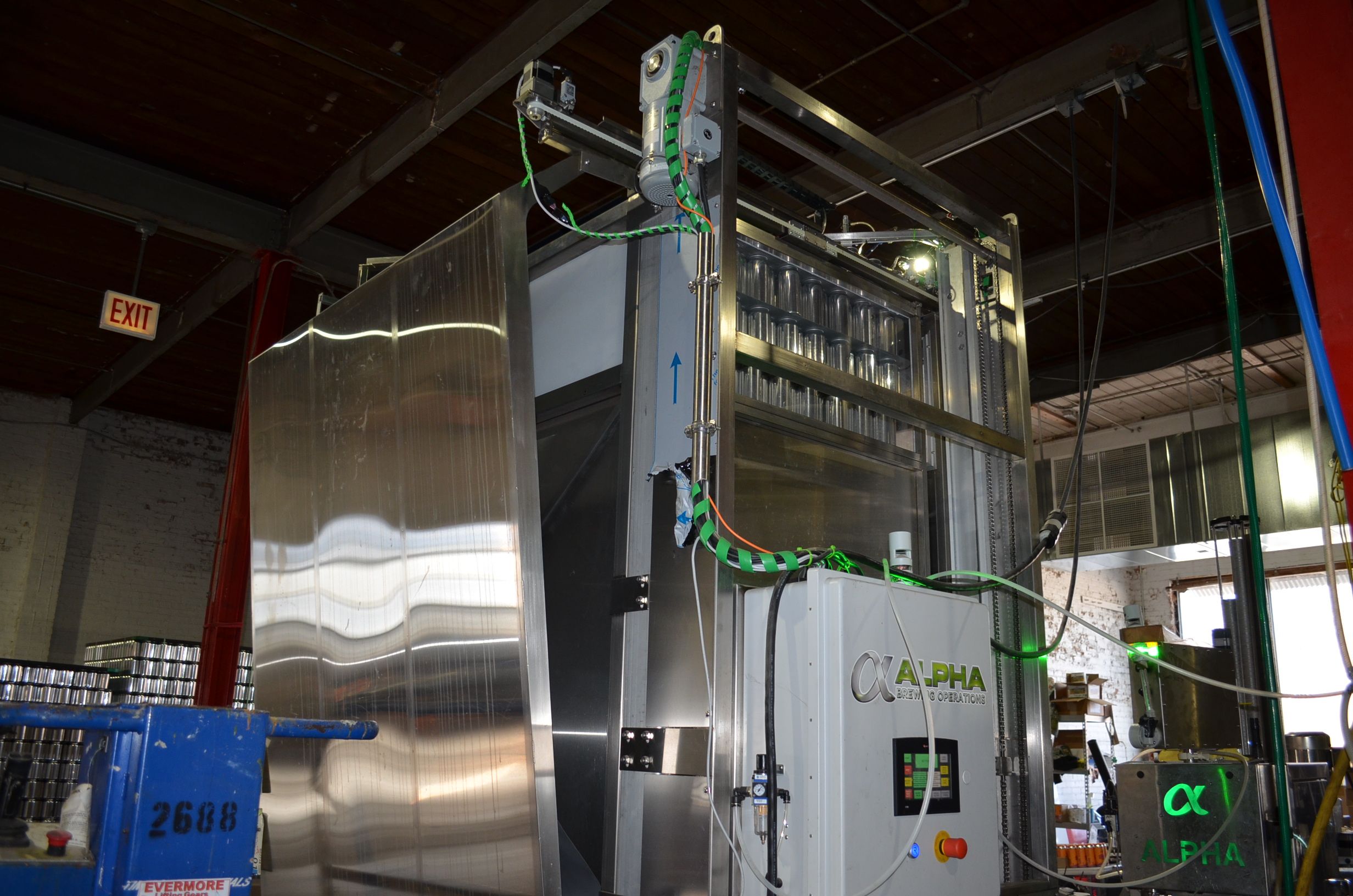 Alpha Brewing Operations Stainless Steel Can Depalletizer with Top Mounted Conveyor and Twisting Can Inverter and Can Risner