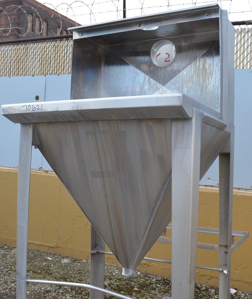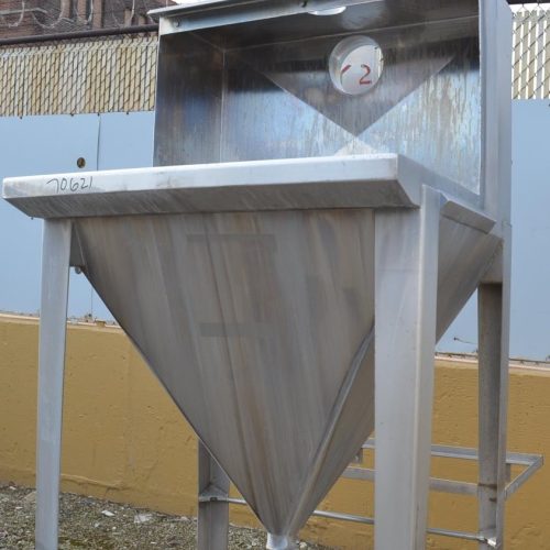 American Process Systems Model NFBD200 S/S Cone Bottom Bag Dump Station. 42 in L x 33.5 in W x 36 in D Open Top Main Chamber. 8 in Diameter Tri-Clamp Back Top Inlet, 3 in Diameter Tri-Clamp Center Bottom Outlet, 27 in Discharge Height, Ground to Main Chamber Edge 67 in H, S/S Legs.
