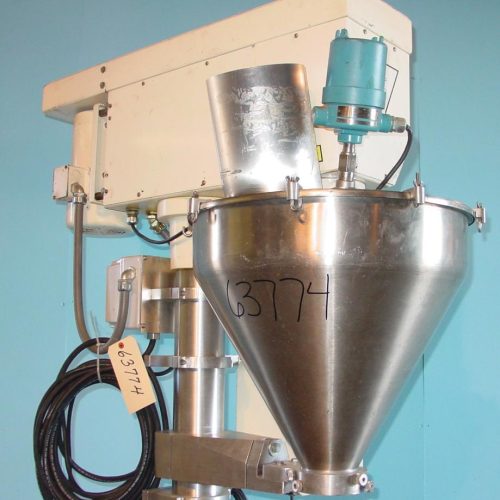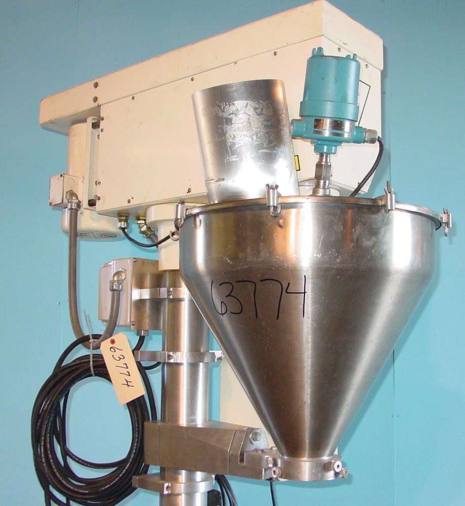 AMS Mdl A100 Semi automatic Auger Filler on stand, 21 in dia x 20 in D cone hopper w/ 3 in bottom opening, 8 in x 5 in top port w/ cover, 7 in dia top inlet, top mounted level detector, foot petal, Main drive 3/60/230, controls: 1/60/115 (upgraded digital controls installed around 2005), 10 in x 10 in s/s Container platform adjustable height. The A-100 is a heavy duty semiautomatic filling machine capable of dispensing powders, granules, liquids, creams or pastes. All product contact parts are Stainless Steel and designed for easy cleanup and change-over. A footswitch and auto recycle timer come standard on the AMS A-100. The recycle timer allows operators to set and maintain a production rate. A volumetric filler, the A-100 typically exceeds accuracies of + or - 1%. AMS uses commercially available parts, which minimizes cost of ownership and maximizes your bottom line