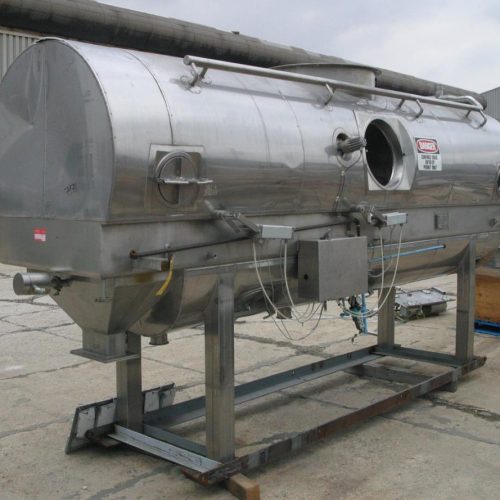 APV Model FBTS2, 32 in W X 185 in L S/S Continuous Fluid Bed Dryer T304 S/S 32in. Wide X 185in. Long Perforated Screen. Inner Spray Balls, Insulated Top Cover . 30in. Top Opening, Approx 8in. Side Top Inlet, 9 1/2in. X 5in. Side Outlet. (1) 17 X 11, (1) 37 X 11 Side Air Inlets. Mounted On 4 Legs, Approx 29in. High Discharge Height