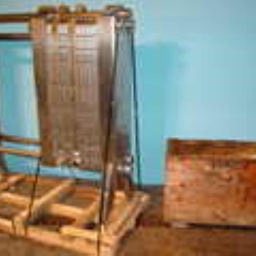 APV Model R51 Royal Paraflow approx 400 sq ft S/S plate Heat Exchanger, mounted on unit (59) S/S 16 in W x 60 in H plates, (26) spare plates , (2) 2 1/2 in W terminal section plates w/ 2 1/2 in triclamp ports, 3 in tri clamp in and out ports, manual twin screw clamp, up to 225 PSI