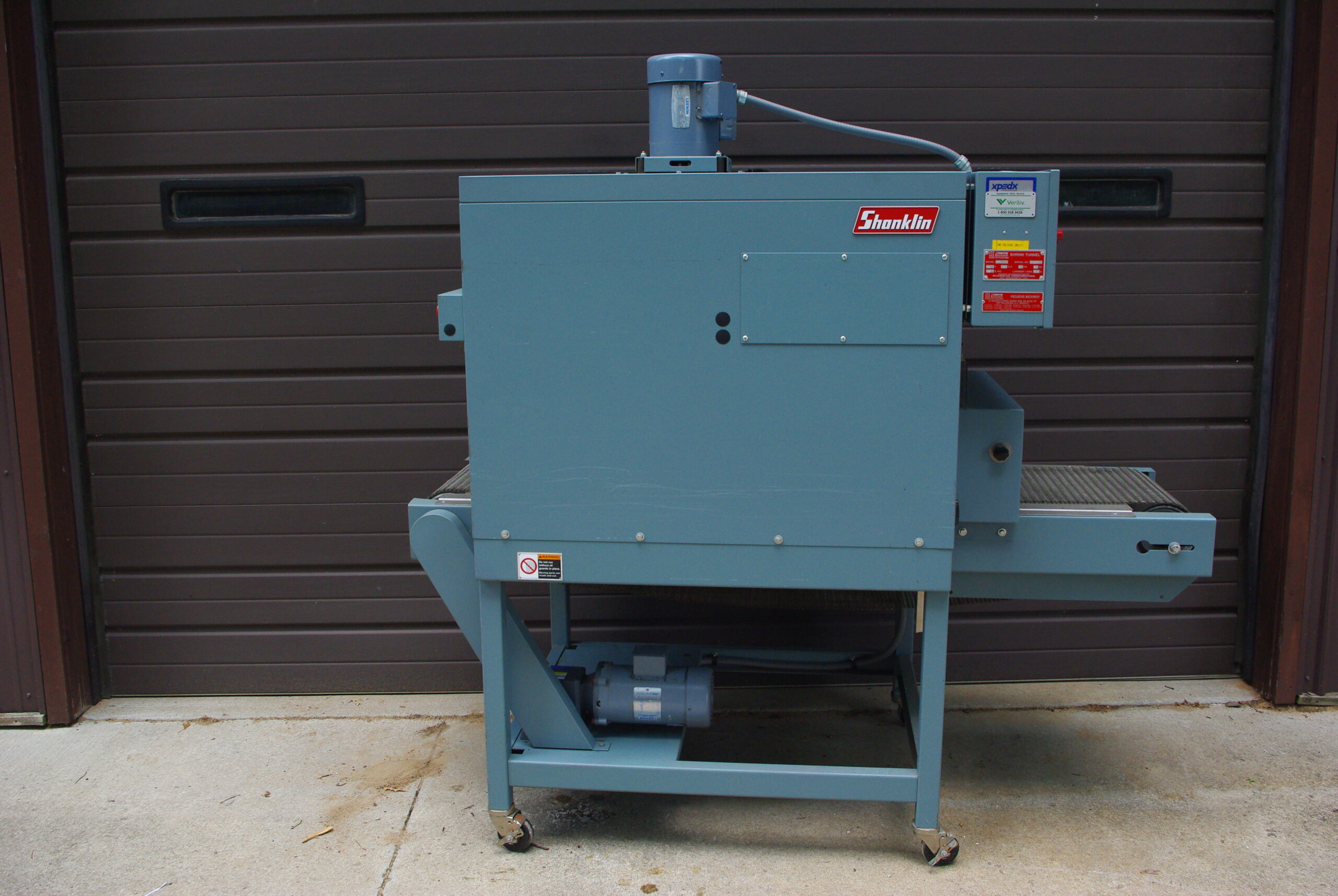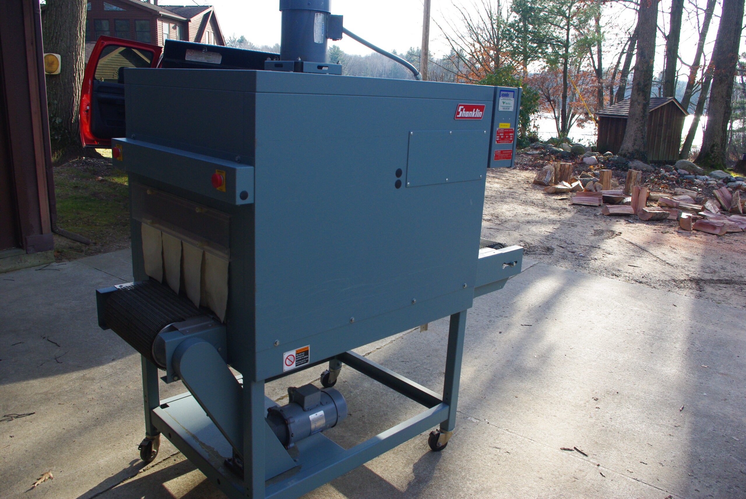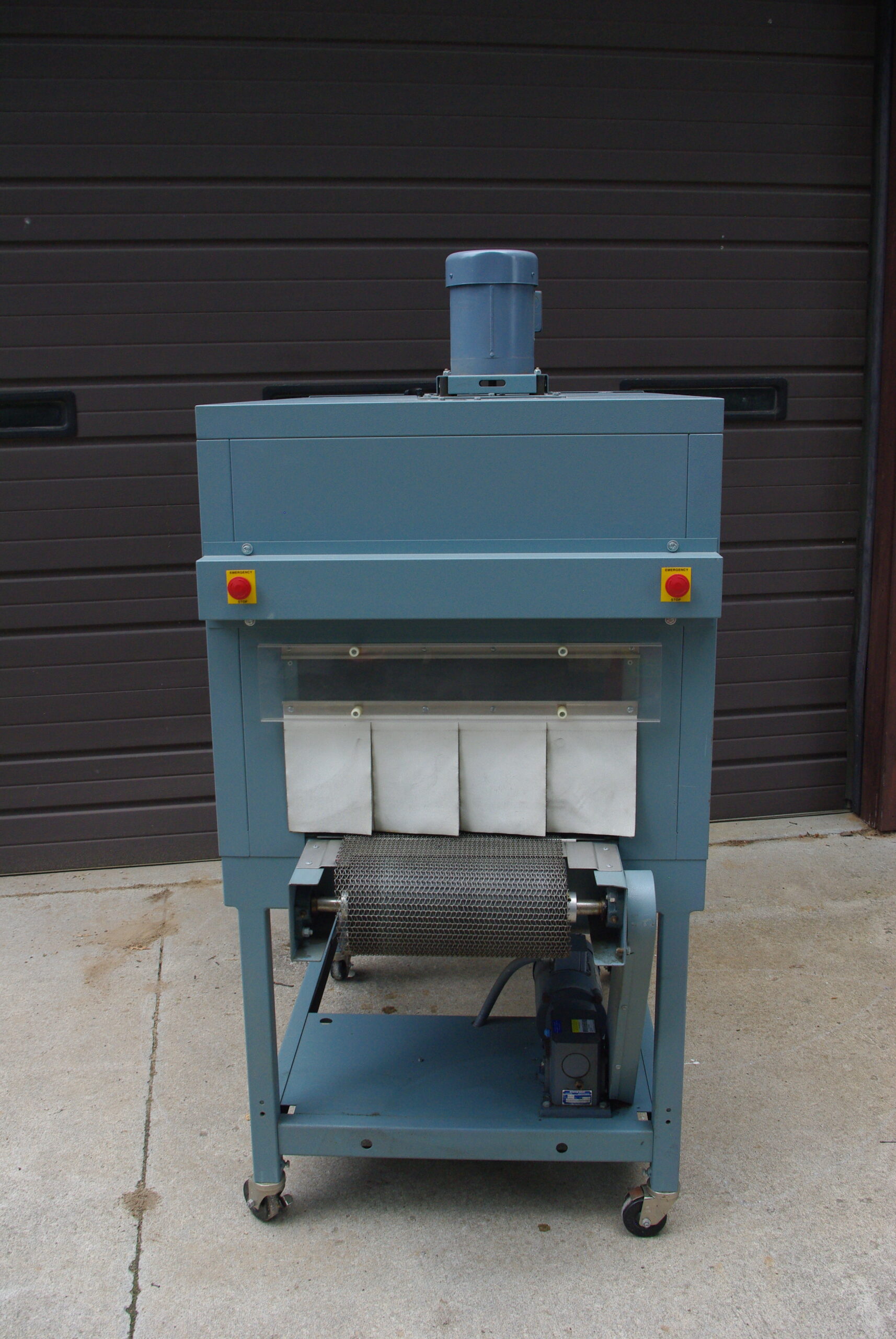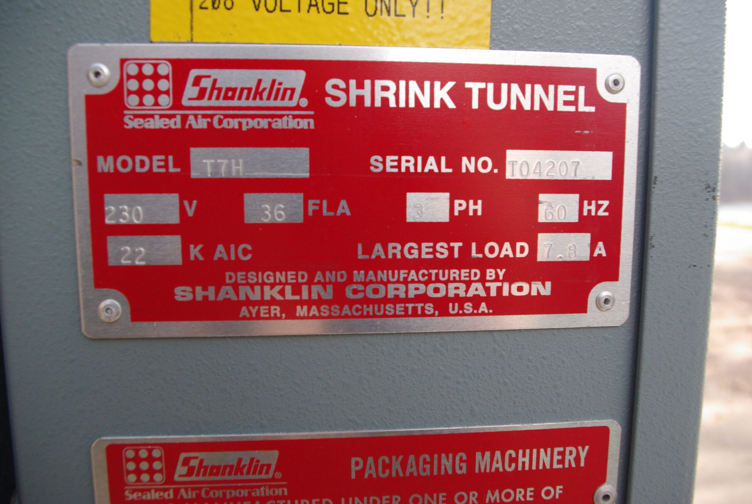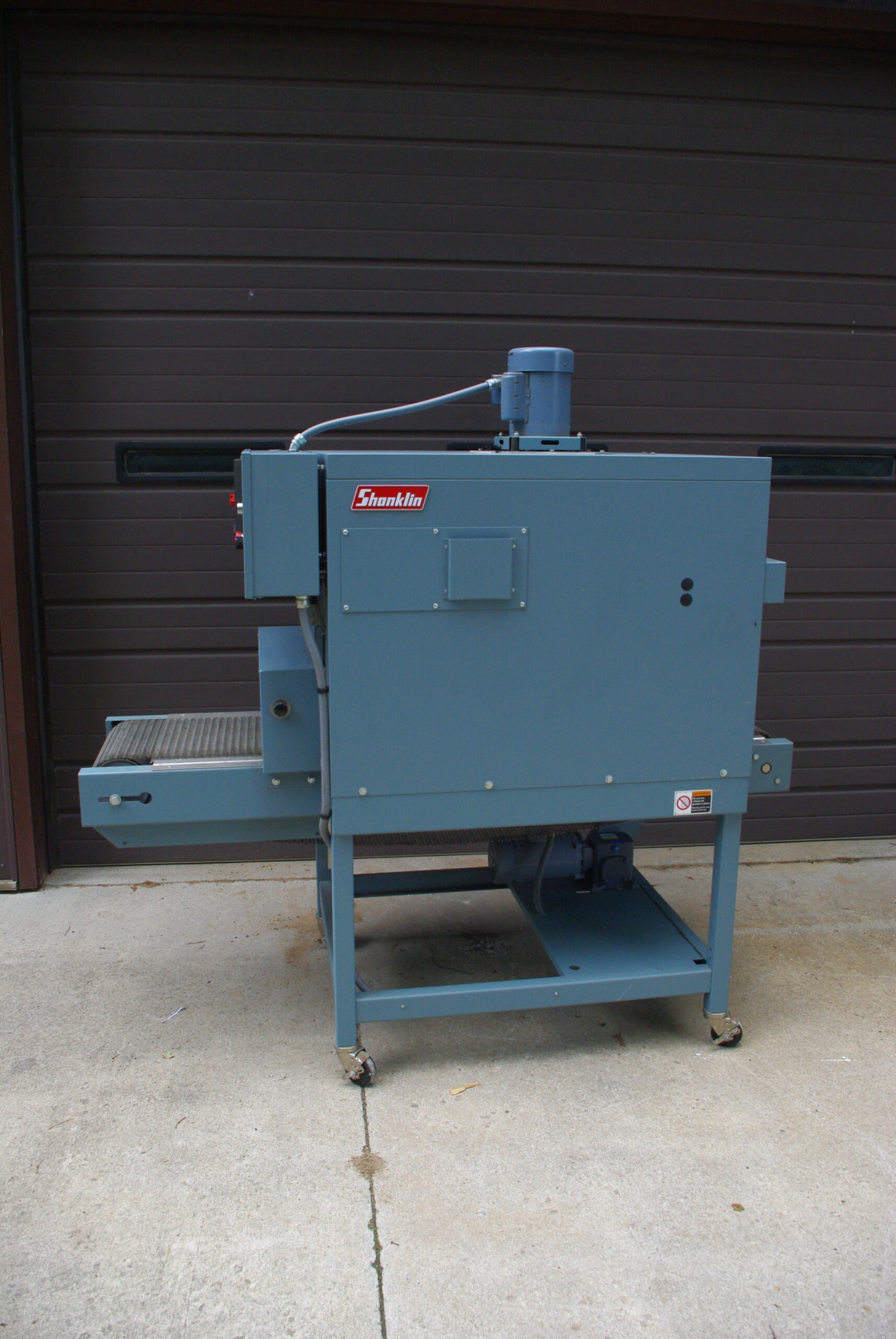 Arpac Hanagata Model L18 Intermittent Motion Automatic L Bar Sealer, Speeds up to 40 products per minute based on a 7 in W x 4 in L x 1 in H product. Variable conveyor speed from 45-90 FPM. Product size range: 1 1/2 in to 15 in Wide x 4 in to 18 1/2 in Long x 1/4 in to 6 in High. 25 pound max package weight. Package width plus height cannot exceed 17 3/4 in. Package length plus height cannot exceed 19 1/2 in. Film size: 24 in centerfold maximum, 11 1/2 in diameter, B wind Polyolefin, PVC or polyethylene. Seal bar dimensions: 17 3/4 in W x 19 1/2 in L. 33 in L x 15 in W rubber infeed conveyor, 23 in L x 15 in W rubber take away conveyor. Film cradles for simple film loading Guillotine style seal head, Independent scrap film rewind system with motor and closed loop operation. Shanklin Model T7H 42 Inch Long Heat Shrink Tunnel. 22 in W x 8.25 in H openings, 15 in W wire mesh chain conveyor, single heat zone, variable speed conveyor, 230 V, 3 Ph, 60 Hz.