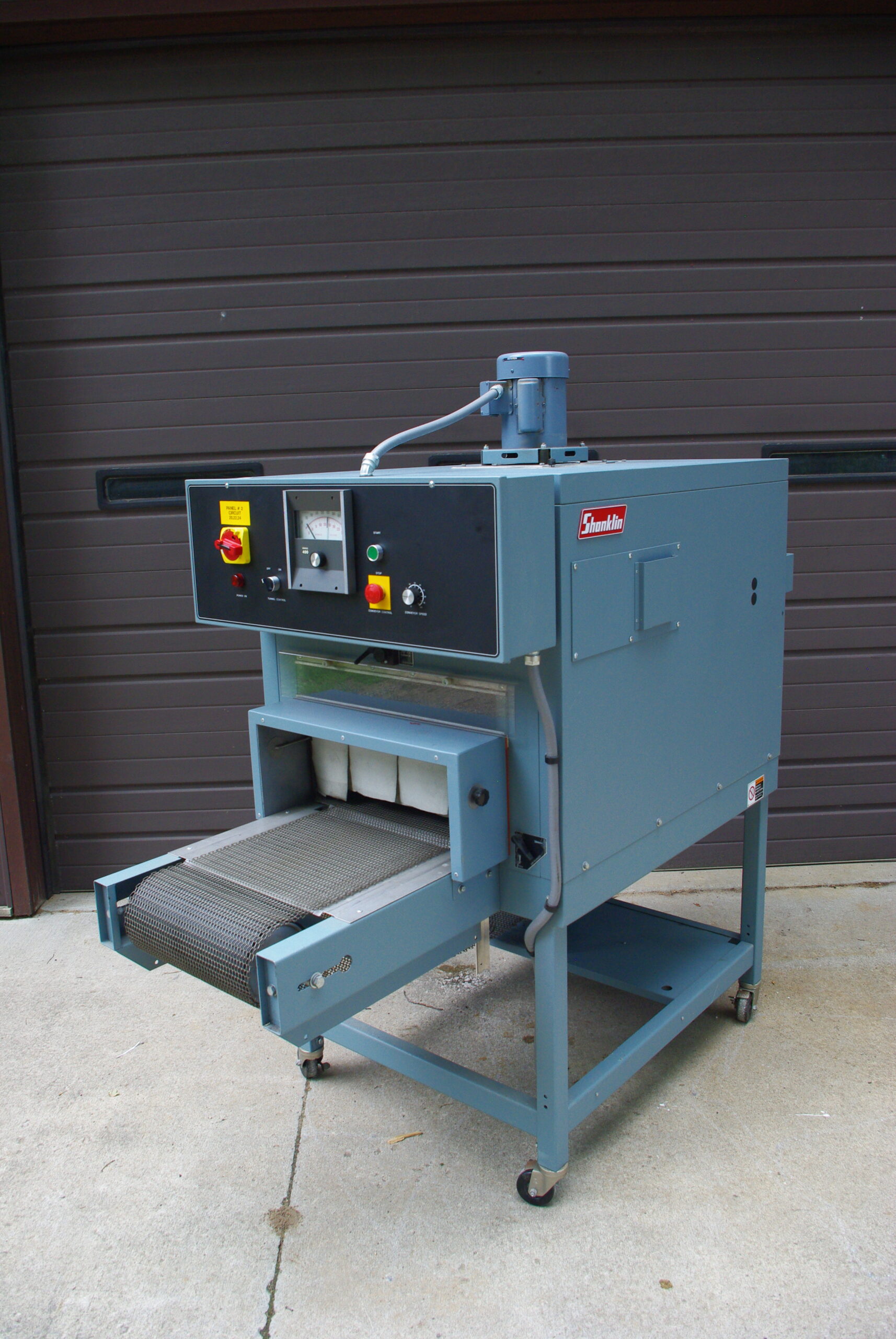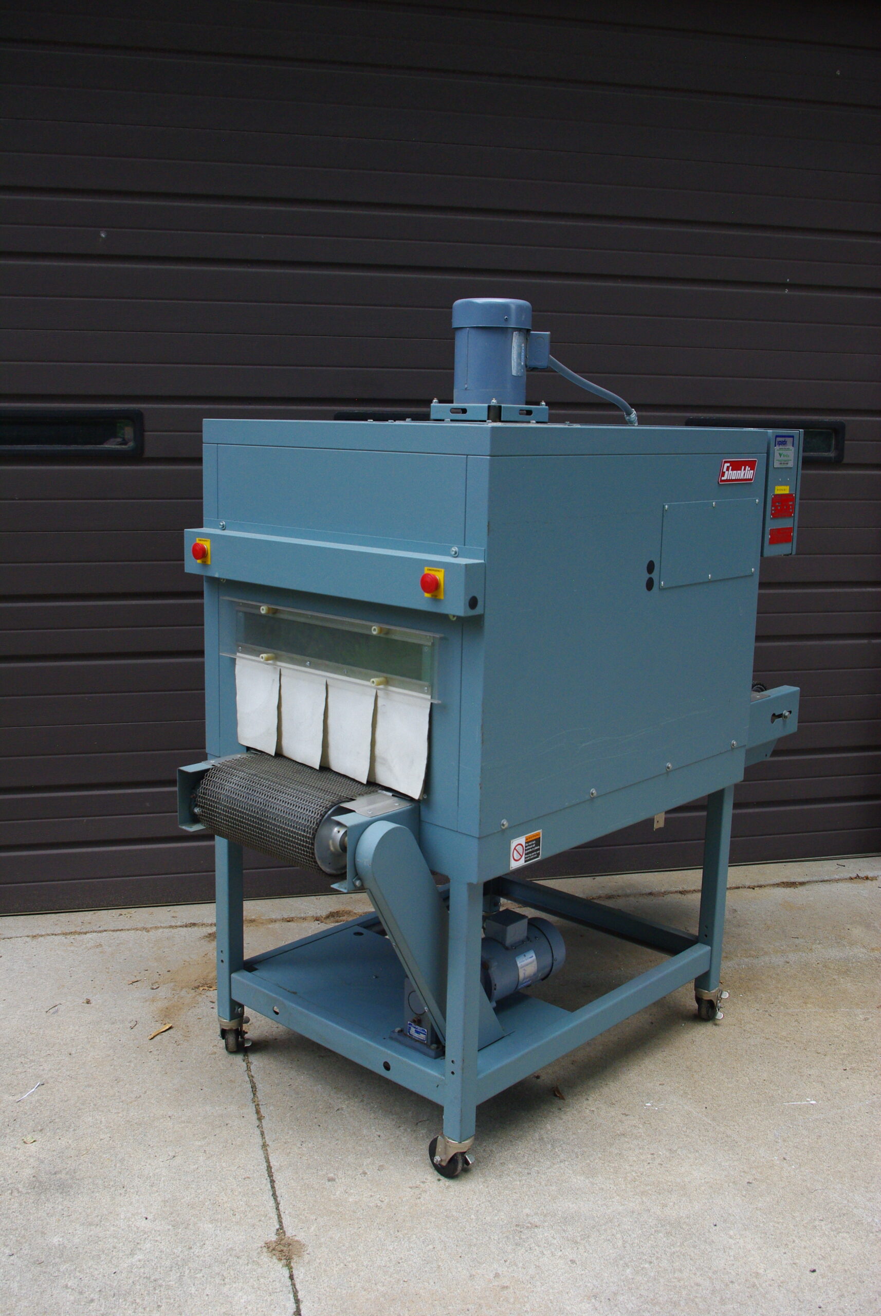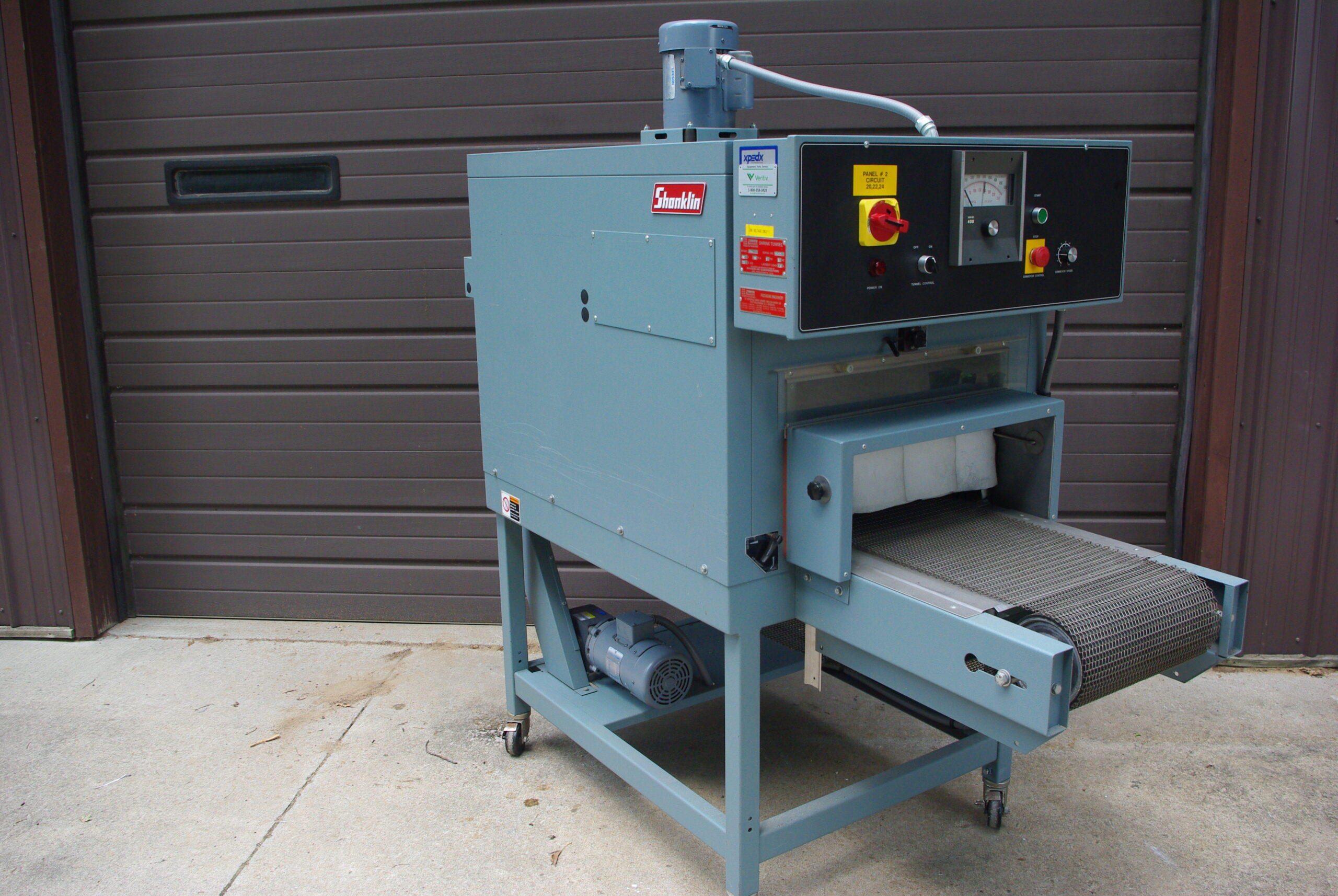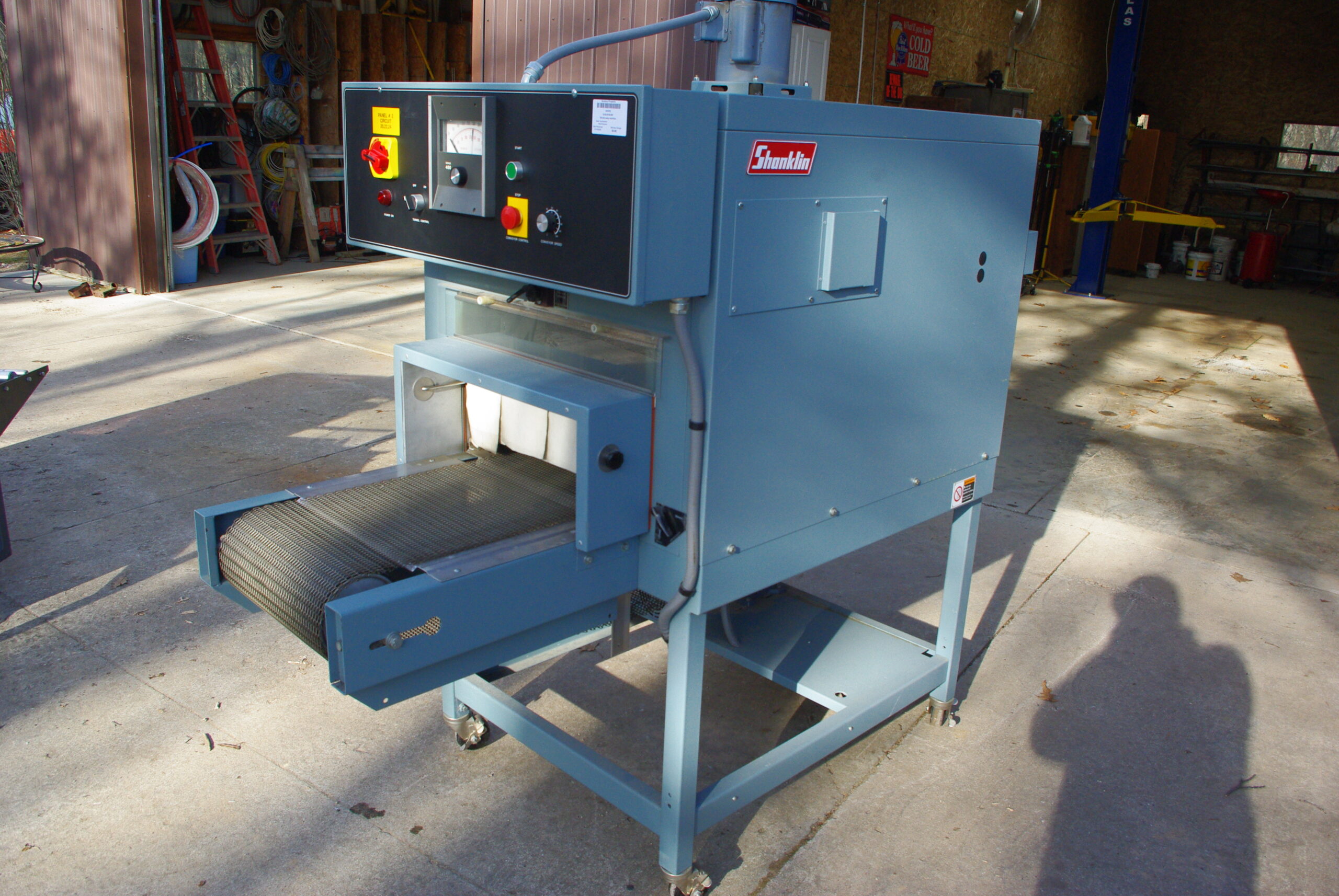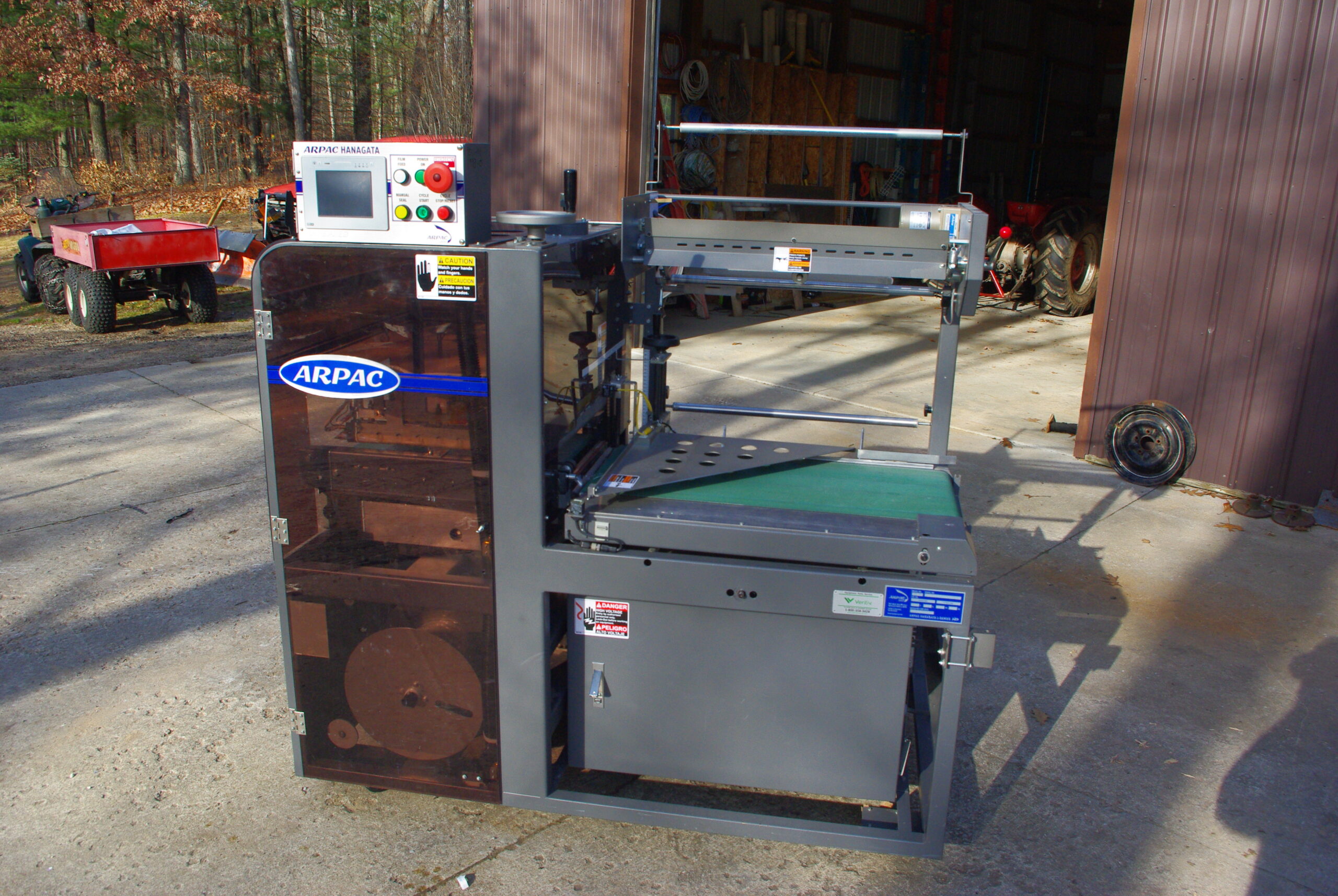 Arpac Hanagata Model L18 Intermittent Motion Automatic L Bar Sealer, Speeds up to 40 products per minute based on a 7 in W x 4 in L x 1 in H product. Variable conveyor speed from 45-90 FPM. Product size range: 1 1/2 in to 15 in Wide x 4 in to 18 1/2 in Long x 1/4 in to 6 in High. 25 pound max package weight. Package width plus height cannot exceed 17 3/4 in. Package length plus height cannot exceed 19 1/2 in. Film size: 24 in centerfold maximum, 11 1/2 in diameter, B wind Polyolefin, PVC or polyethylene. Seal bar dimensions: 17 3/4 in W x 19 1/2 in L. 33 in L x 15 in W rubber infeed conveyor, 23 in L x 15 in W rubber take away conveyor. Film cradles for simple film loading Guillotine style seal head, Independent scrap film rewind system with motor and closed loop operation. Shanklin Model T7H 42 Inch Long Heat Shrink Tunnel. 22 in W x 8.25 in H openings, 15 in W wire mesh chain conveyor, single heat zone, variable speed conveyor, 230 V, 3 Ph, 60 Hz.