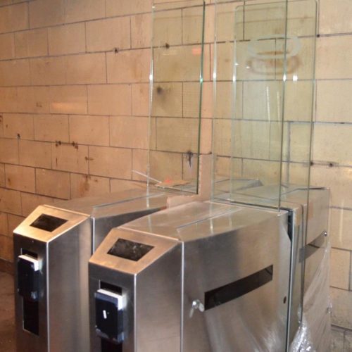Automatic Systems Model PNG380 Stainless Steel Waist Height Retractable Glass Panel Security Entrance Gates. Four Modules to Form Two Lanes. 60 Passages Per Minute. 23 in Passage Width. Indoor Use Only. Manufactured 2002. 1/2 in Thick Clear Glass Panels. S/N A0110, A0111, A0112 (4th S/N not available).