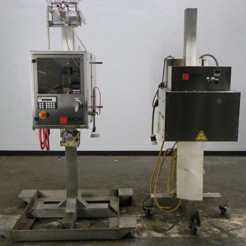 Axon Model EZ-100 Heat Shrink Tamper Evident Band and Sleeve Label Applicator. Rated up to 150 PPM depending on the container. Machine is of stainless steel construction Sleeve size 20 to 100mm flat x 25 to 200mm high x 40 to 100mm microns x 1.5 to 4.0 mil. 16 in x 18 in adjustable height shelf. Has side-mounted air-powered sleeve tamping device. Has printed film registration. Mounted on a stainless steel stand. Includes an Allen-Bradley MicroLogix 1500 controller. Has film perforator. Machine footprint 48 in long x 40 in wide x 84 in tall. Also Includes shrink tunnel mounted on a stand.