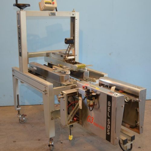 Belcor Model 150 Semi-Automatic Top and Bottom Case Sealer with Dekka Model 23, 3 in Wide Tape Heads. Includes Belcor Model 505 S/S Semi Automatic Case Former Packing Station. Speeds Up To 30 CPM. Minimum Case Size 8 in L x 5.5 in W x 4 in H, Maximum Case Size Unlimited L x 17 3/8 in W x 21 in H. Dual 2 3/4 in W Side Gripper Belts. Minimum Case Size 8 in L x 6 in W x 3.5 in H, Maximum Case Size 26.5 in L x 16 in W x Unlimited H. Bottom Major and Minor Flap Folding Mechanism, 80-90 PSI, 0.1 CF Per Cycle. Aluminum and Stainless Steel Construction.