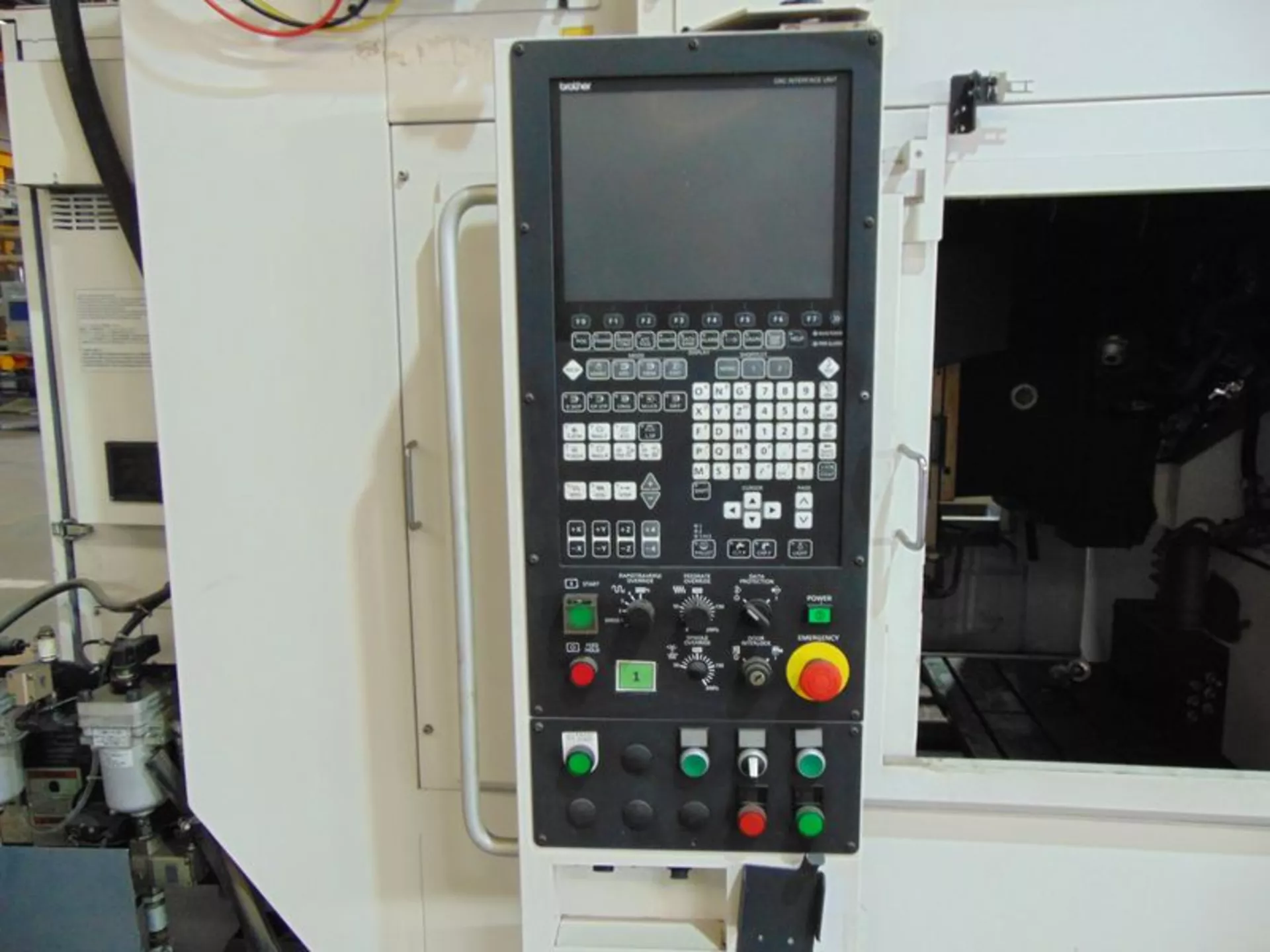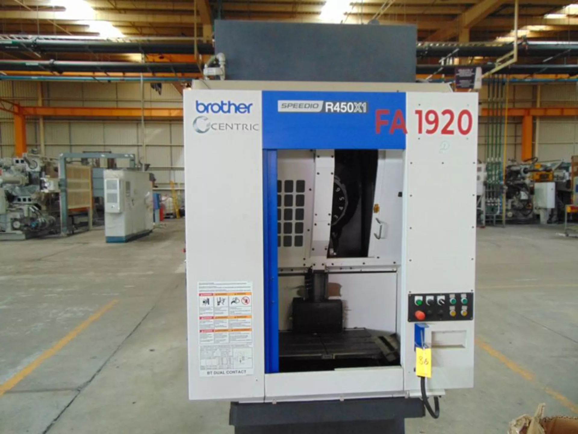 Brother SPEDIOR45X1 CNC Vertical Machine Center; To Include but not limited to: Pallet changer: Brother QT 2-face pallet system; Table (each face): 600 x 300 mm; Max table load: 120 kg; Travels (X/Y/Z): 450 / 320 / 305 mm; Spindle taper: BT30 (7/24 No.30); Max spindle speed: 10,000 rpm; Spindle motor rated capacity: 6.7; Automatic tool changer: 14 or 22 tools; Rapid traverse (X/Y/Z): 50 m/min; Max cutting feed: 30,000 mm/min; Coolant: Flood, TSC optional; Electrical: Approx. 220V, 3-phase; Description: High-speed pallet-changing CNC drill and tap machining center with compact footprint for high-production environments. 1 Ea. misteraia show general industrial dust and particles collection; fan/blower integrated. and hydraulic unit for clamping vertex S/N: 113225, 2017, Ref: FA1920