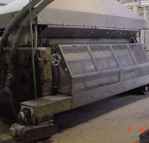 Buflovak 42 inch diameter x 120 inch face double drum dryer. Cast drums w/chrome plating, requires rechroming. Drums last used 135 psi steam at 350 degrees F, reportedly likely rated presently at 160 psi. Each includes side discharge screw conveyors with end choppers.