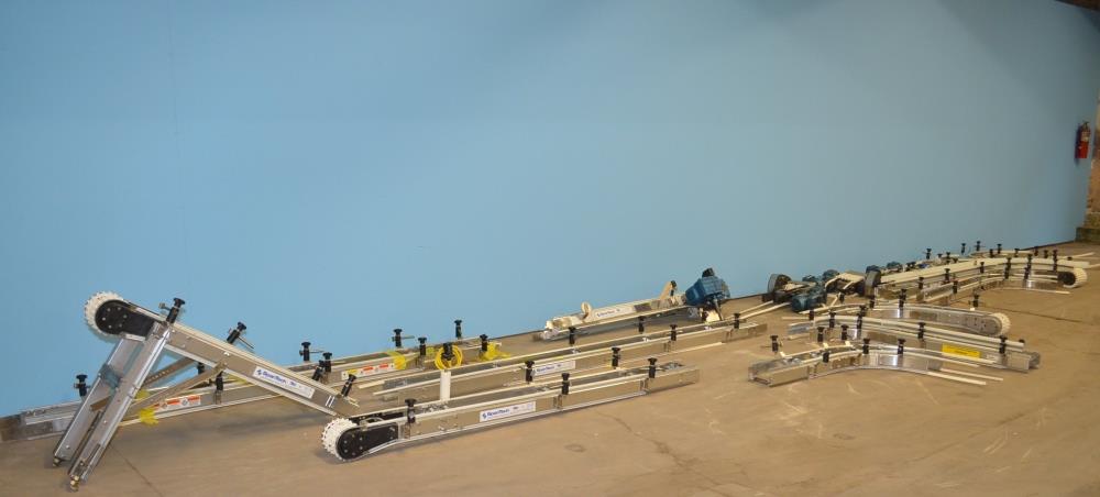 Assorted Straight and Curved Sections Perfect For Building a Custom Span Tech Plastic Interlocking Chain Conveyor. 7 1/4 in Wide Plastic Interlocking Chain Belting. Conveyor Sections Available Include: (1) 54 in L Straight Section with Idler. (1) 90 in L Straight Section with Idler. (1) 108 in L Straight Section. (1) 114 in L Straight Section. (1) 60 in L Straight Section with SEW Eurodrive Type DRS71S4MM03MO, 1/2 HP Drive Motor, 380-500 V. (1) Approx 60 in L 90 Degree Curve Section. (1) Approx 72 in L 90 Degree Curve Section. (1) Approx 60 in L 90 Degree Curved Section with Idler. (3) 19 in L Straight Transition Sections with SEW Eurodrive Type DFT71D4, 1/2 HP Drive Motor, 230/460 V, 3 Ph, 60 Hz, 1700 RPM. (1) Approx 72 in L 90 Degree Curved Section. (1) Approx 102 in L 90 Degree Curved Section. (3) Approx 24 in L 90 Curved Sections. All sections with S/S Frames, Provisions For Adjustable Guide Rails. Assorted Lengths of Plastic Interlocking Chain. (16) Pairs of 29 in H S/S Support Legs with Height Adjustable Leveling Feet. Assorted Poly Guide Rails.