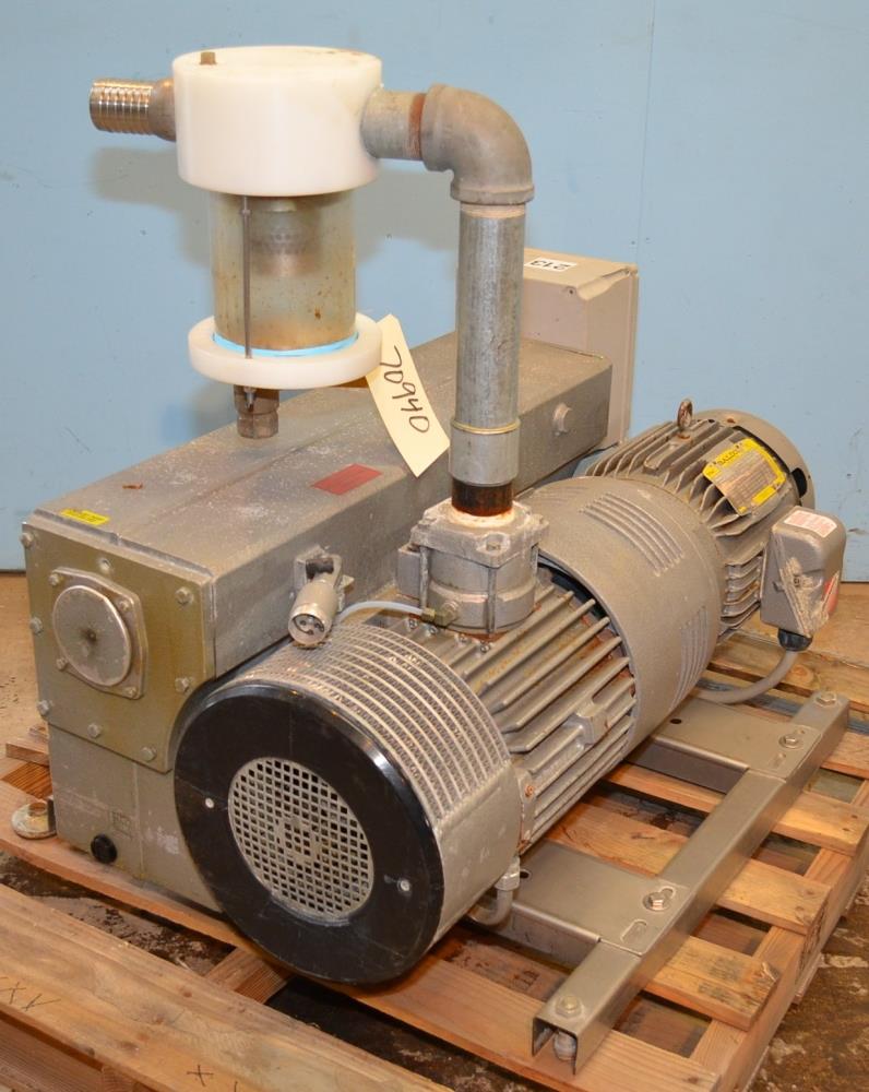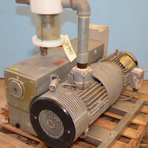 Busch Model RA0305D5H61001 12 HP Single Stage Rotary Vane Vacuum Pump. Direct Drive, Air Cooled, Oil Sealed. Nominal Pumping Speed 196 ACFM, Free Air Displacement 212 CFM, 0.5 Torr End Vacuum, 29.9 Inches Hg End Vacuum, 2 in NPT Inlet, 2 in NPT Exhaust Connection. 230/460 V (Wired 460 V), 3 Ph, 60 Hz, 1760 RPM, 29.8/14.9 Amp.