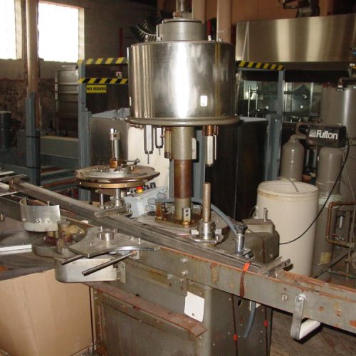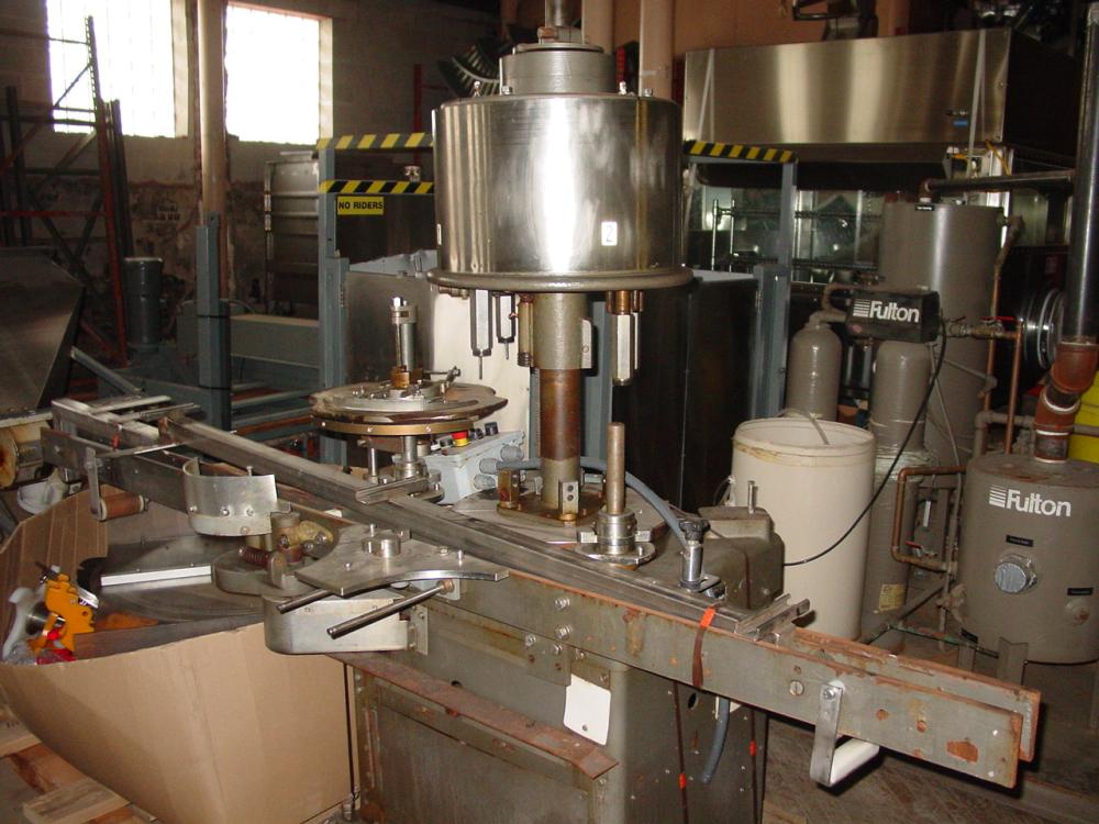 Capem Model D4A 4-Head Rotary Chuck Capper on C/S frame Rated to 120 cpm. (Depending on cap size and configuration) currently set on 79mm. 2 HP, 1725 RPM, 3Ph, TEFC motor. 9 1/2ft L x 2 1/2in W C/S frame conveyor, C/S cap hopper mounted on 8ft H S/S frame stand with 3/4 HP motor.