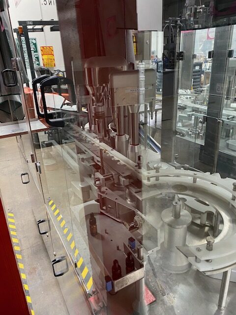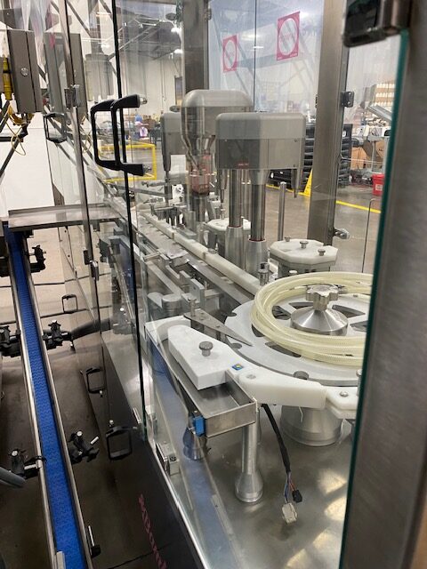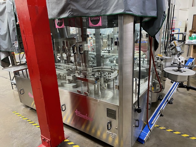 Capmatic Model BambinaFPCL Stainless Steel Monoblock Filler, Dropper/Plugger, and Labeler. Speeds up to 40 BPM Depending on Product and Container. Includes Rotary Turntable Infeed, Liquid Filler, Tincture/Dropper Plug Inserter with Vibratory Bowl Feeder. Screw Capper with Vibratory Bowl Feed and Pressure Sensitive Wraparound Labeler. Touch Screen HMI. 208 V, 3 Ph, 60 Hz.
