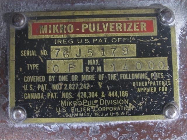CF Bantom Mikro Pulverizer S/S Hammer Mill. 4 in Diameter, Screw Feeder Driven by .25 HP Motor, 2 HP Main Drive, 230/460 volt. Mounted on Portable Support Stand.