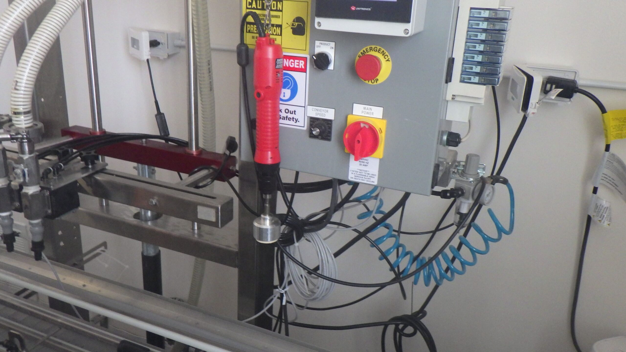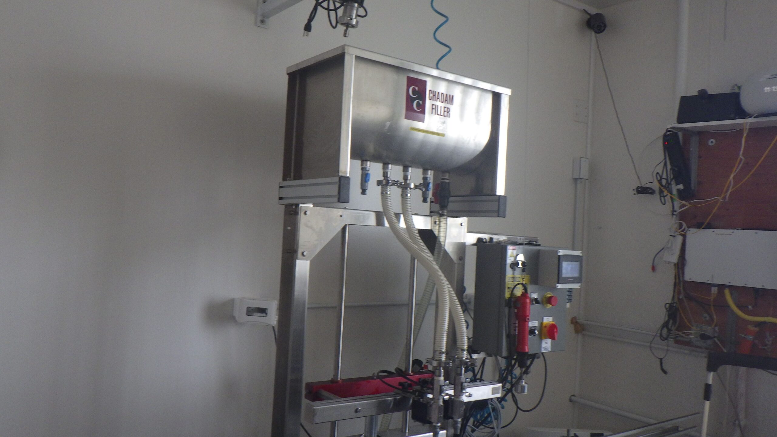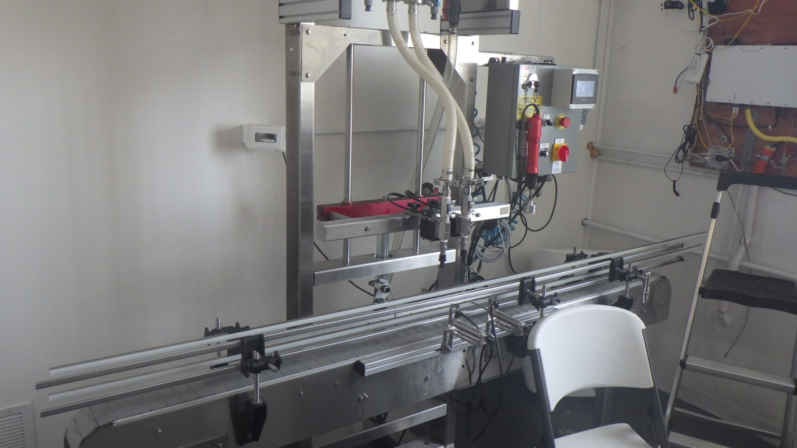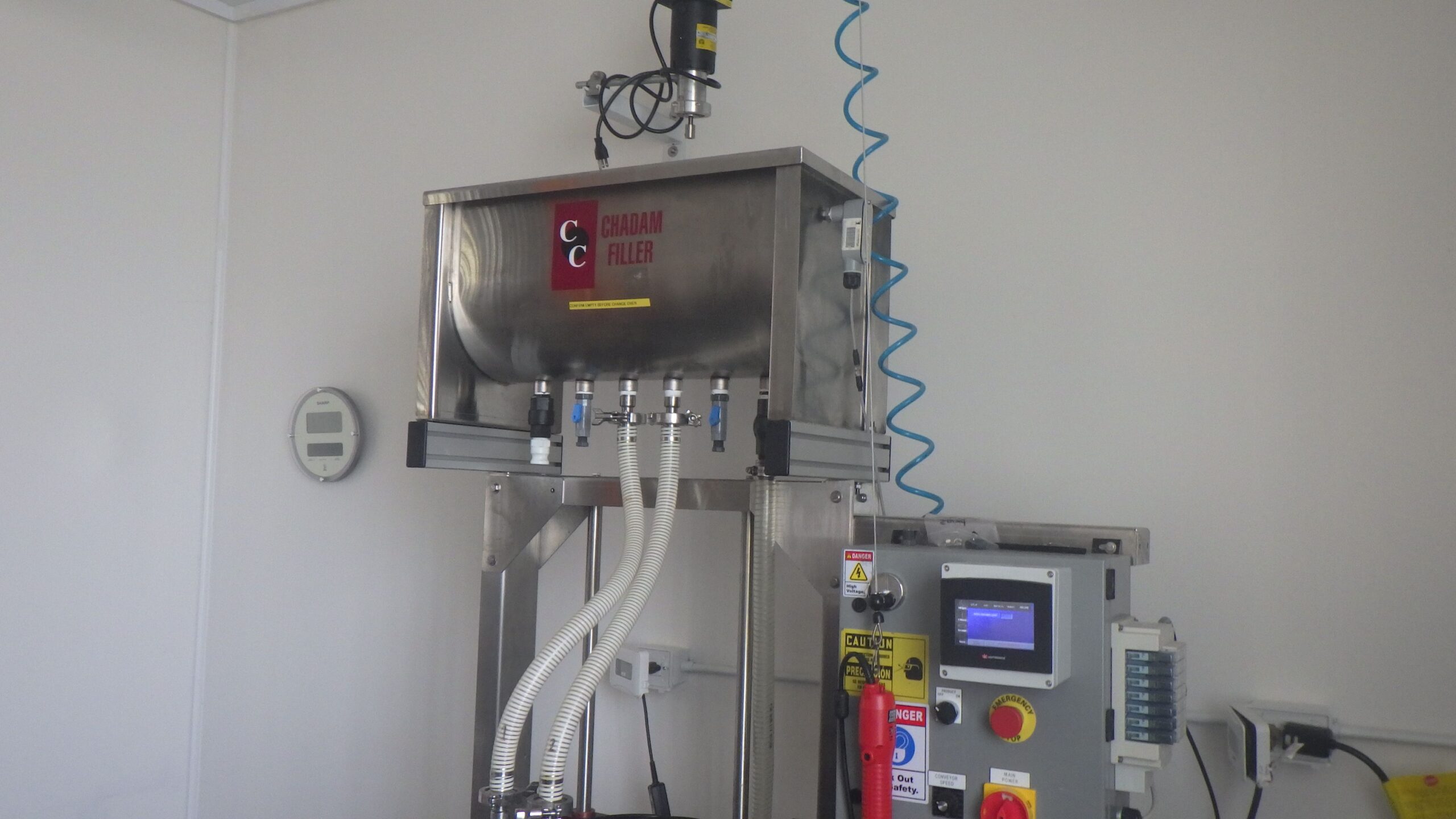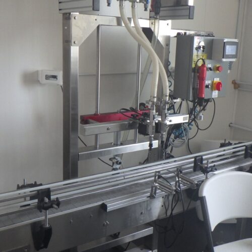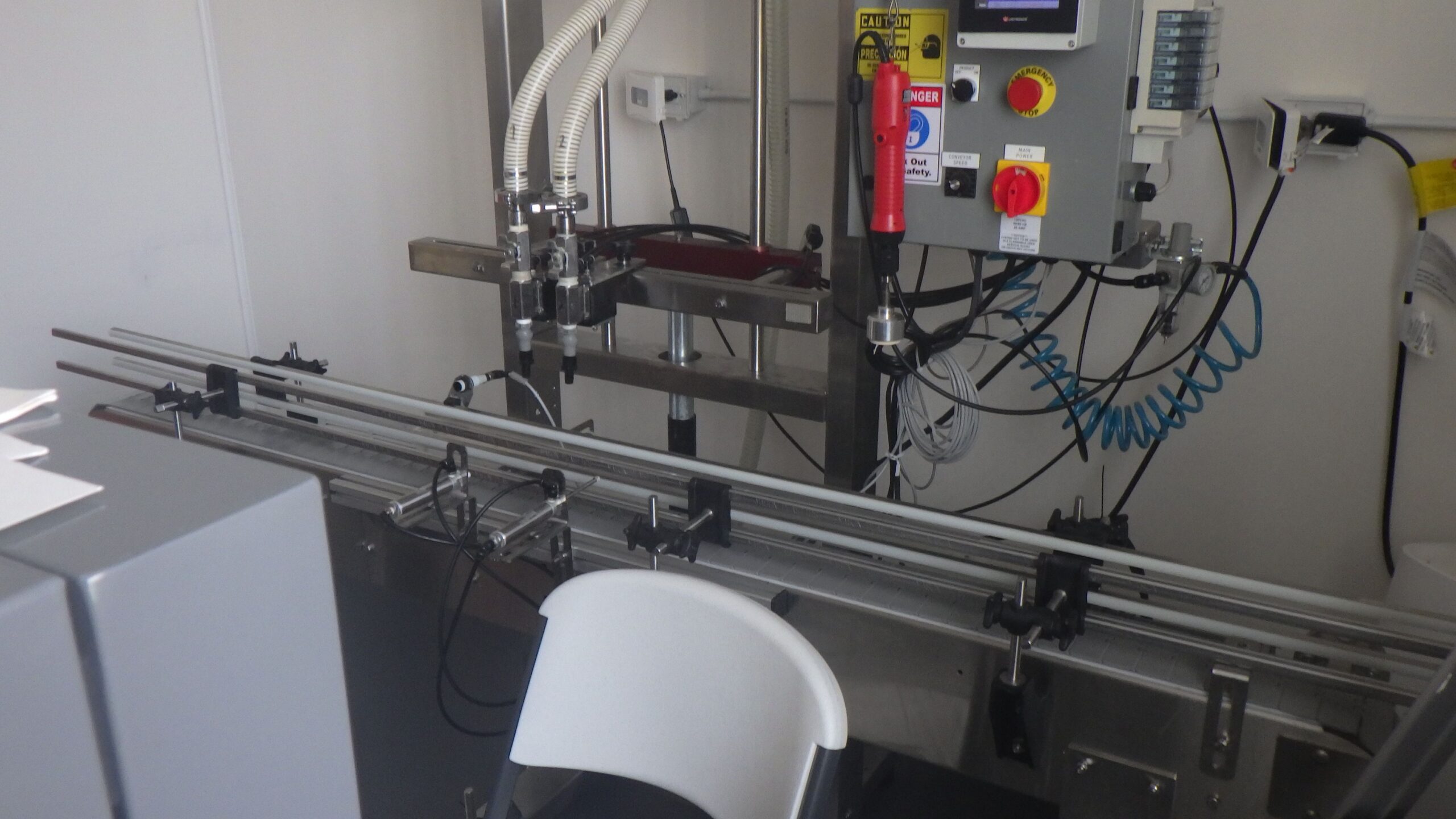 Chadam S/S (2) Head Inline Gravity Fed Filler with Manual Screw Capper and Digital HMI Controls
