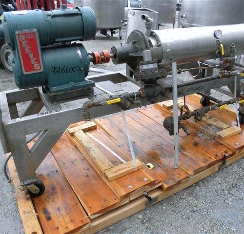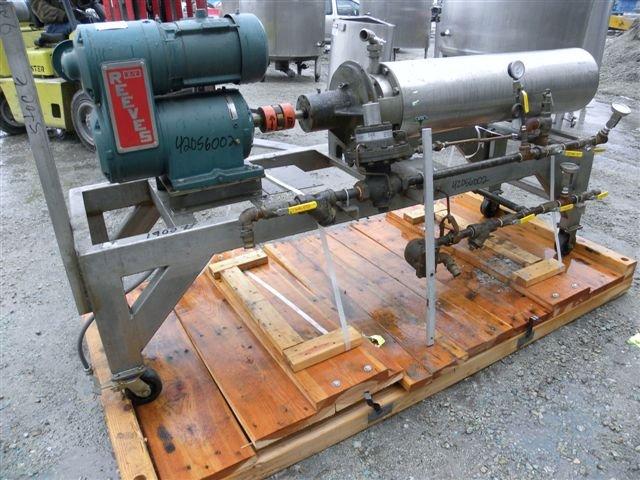 Chemetron Votator 6 Sq Ft Horizontal 304 S/S Scraped Surface Heat Exchanger. (1) Approximately 6in diameter x 48in long horizontal chamber, plastic type scrapers, jacketed. 1-3/4in inlet and outlet. Driven by a 5 hp, 3/60/230/460 volt, 1730 rpm Reliance variable speed motor, ratio 20.9 to 1, minumu/maximum rpm 20/200. Mounted on a stainless steel frame with casters.