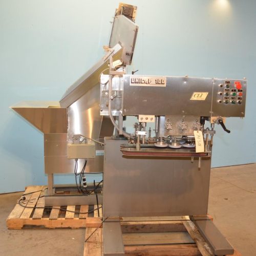CLI Model Unicap100 (6) Quill Inline Spindle Capper with Model ELEVBA S/S Cap Elevator. Speeds up to 120 Containers Per Minute. Container Maximum Size 13.5 in H, 4 in W, 8 in L. 24 in L x 1 in H Side Cary Belts. Manual Height and Width Adjustment. Variable Speed Belts and Quills. S/S and C/S Contact Parts. C/S Base with Casters. 120 V, 1 Ph, 60 Hz, 20 Amps, 90 PSI, 1 SCFM. Model ELEVBA S/S Cap Elevator with Hopper. 11 in W Delrin Chain Conveyor with 8 in L x 1/4 in W Flights. 58 in L Vertical Section. 62 1/2 in Cap Discharge Height. 5 in W S/S Cap Reject Chute Back Into Hopper.28 in x 22 in x 14 1/2 in Deep S/S Hopper. Plexiglas Covers. S/S Frame and Base. 120 V, 1 Ph, 60 Hz, 8 Amp.