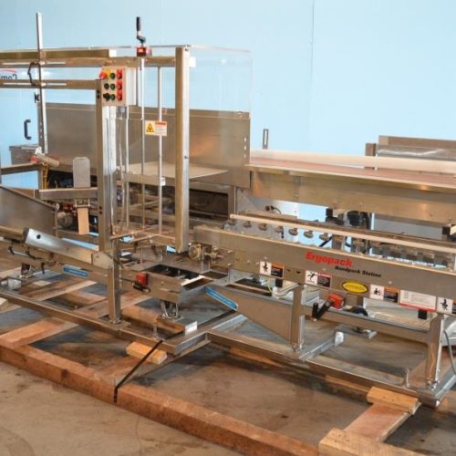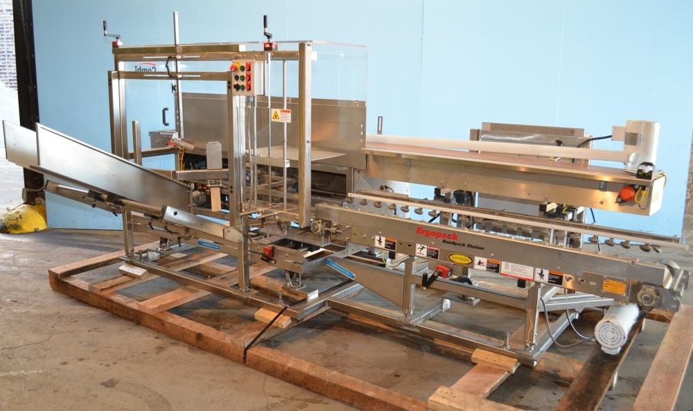 Combi Model E2500 S/S 12 CPM Case Erector with Ergopack Hand Pack Station. Minumum Case Size 8 1/2 in x 4 3/4 in x 4 in. Maximum Case Size 20 in x 13.5 in x 19 in. Speed Up To 12 Cases Per Minute. Left to Right Configuration. 43 in L Walk In Case Magazine. 1 Pair Vacuum Suction Cups. Case Style Capabilities: Regular Slotted Case, Half Slotted Case, Case With Mating Minors, Case With 5th Panel Partition, All Flaps Meeting, Full Overlapping Flaps, Case With Reversed Glued Flaps. 12 in W x 12 ft L Product Conveyor with Plastic Interlocking Chain Belt, Variable Speed, Adjustable Poly Guide Rail, 3/4 HP Drive. Hytrol 8 in W x 69 in L Packing Station Case Conveyor with Vinyl Belting. 230 V, 3 Ph, 60 Hz, 30 Amp, 80 CFM.