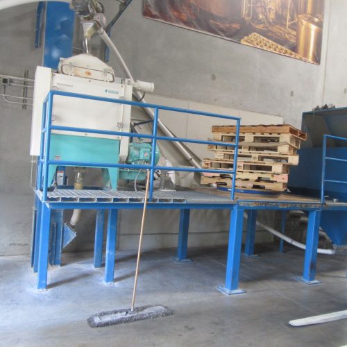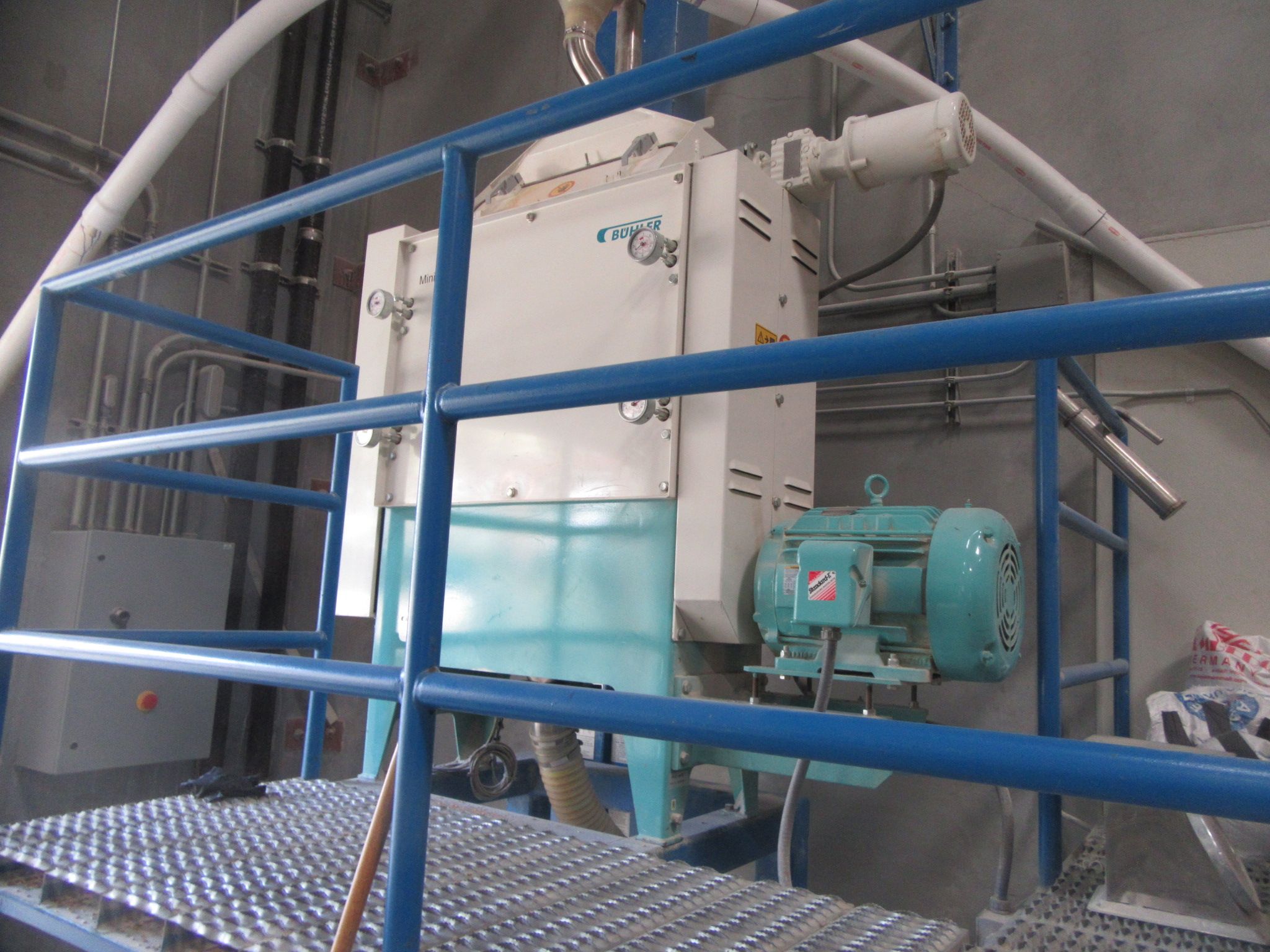 Complete Grain Processing System Including Buhler Model DBZE2 Mini Compact Grain Roller Mill on 8 ft x 15 ft Carbon Steel, Elevated Platform with a Rotary Pallet Stand, Safety Railings and Safety Air Lines. 5 ft x 5 ft x 5 ft Deep Carbon Steel Tapered Bottom Hopper with a Chore Time Flexible Screw Conveyor Discharge Including Carbon Steel Hood and Oneida Dust Collector. Universal Model U1220X20 Carbon Steel, Vertical Grain Elevator with a 55 ft long Carbon Steel Horizontal, Screw Conveyor Discharge. 6 ft Diameter x 8 ft Tall (Straight Side), Carbon Steel, Closed Top, Cone Bottom Side on Load Cells with a Remote Rice Lake Stainless Steel Digital Display and 5 ft Carbon Steel, Screw Conveyor Discharge. Universal Model U2800X17 Carbon Steel, Vertical Grain Elevator with a 55 ft Long Carbon Steel Horizontal, Screw Conveyor Discharge, Etc.