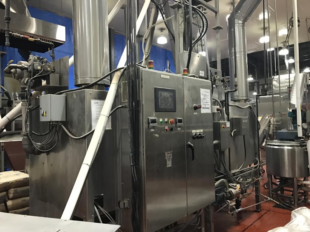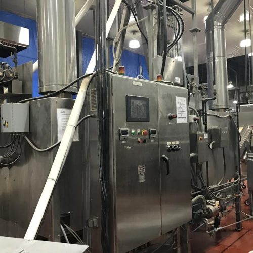 Cretors Model FTG200 Dual 250 Pound G-Zilla Complete Oil Popcorn Popping Line. With Auto Feed System Consisiting of Dual Flexible Screw Augers, (2) Hoppers, 100 Gal Jacketed Agitated Tank For Oil, Cretors 21 Ft Conveyor With Plastic Cleated Belting, Cretors Sifter Cooler, Cretors 18 Ft 460 Volts, Incline Conveyor, 10 In Wide Belting, 4 Ft x 4 Ft x 3 Ft Deep Feeding Hopper, 5 Ft Cone, Spray Dynamics Model MS1 24 In Diameter Seasoning Drum, Powder Application Only.