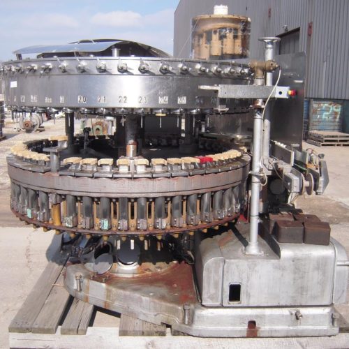 Crown Uniblend 50-12 monoblock filler and capper capable of speeds from 55 to 525 bottles per minute. Container size range: 2 in to 3 7/8 in diameter, 5 in to 12 in tall. Fill size range: 6 oz to 67.6 oz. Monoblock filler/capper, last used on 355 ml PET bottles of beer. 50 head rotary filler with nozzles on 4 in spacing, Zalkin ROPP 12 head rotary capper, reportedly last running up to 300 BPM