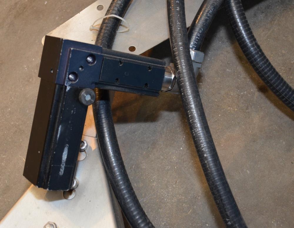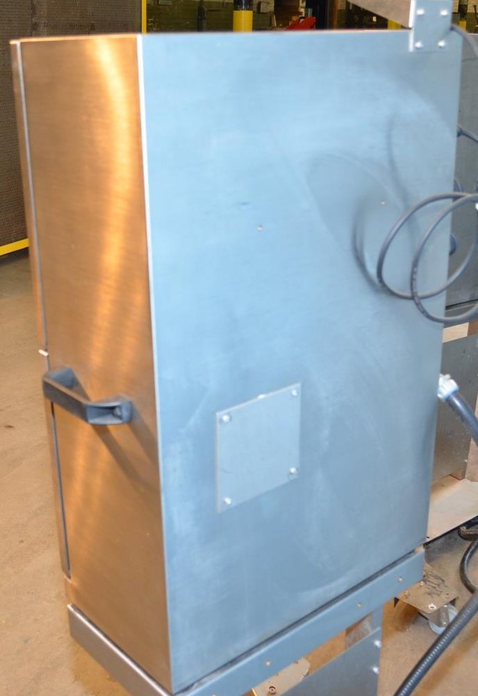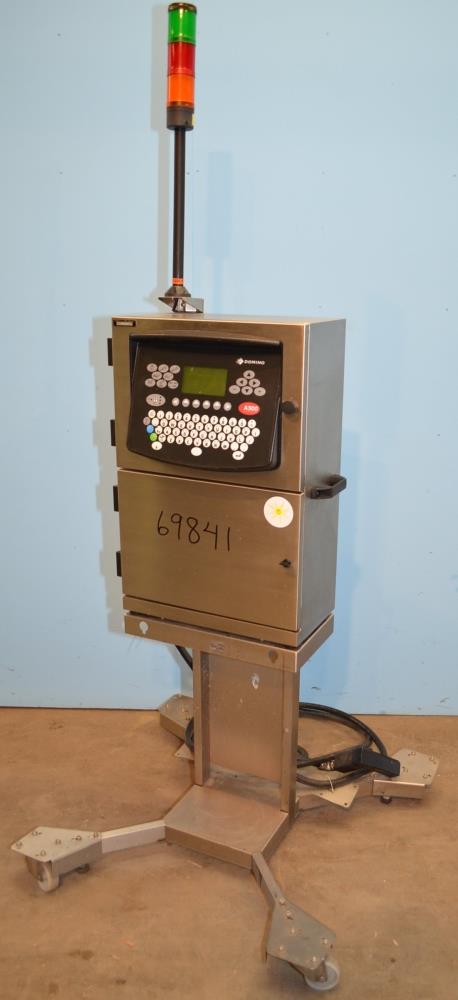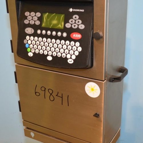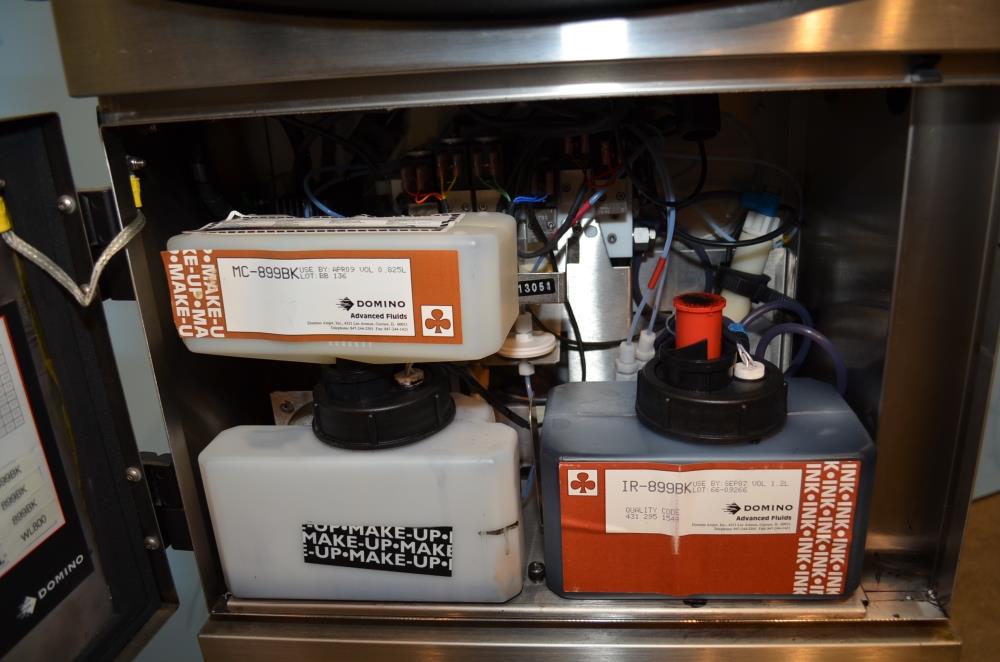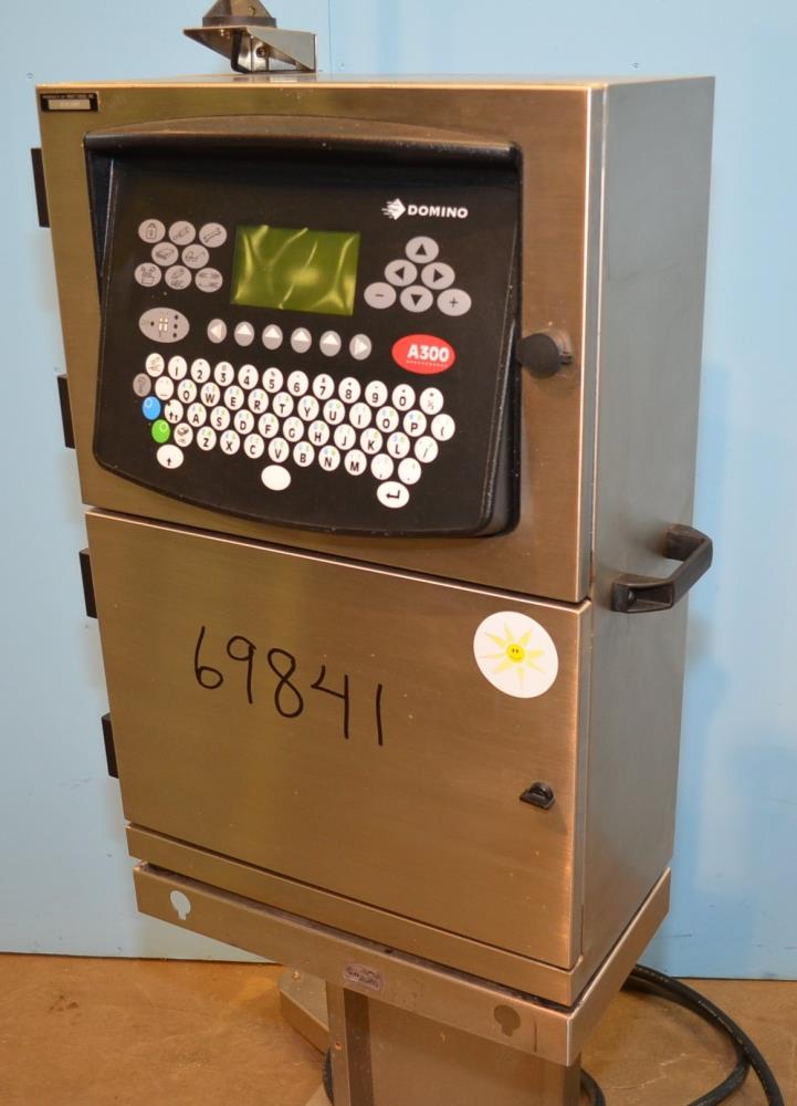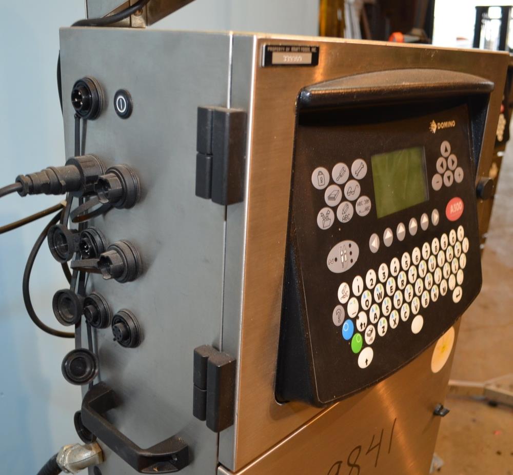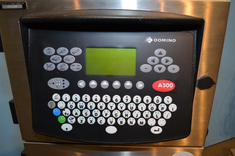 Domino Model A300 Stainless Steel Ink Jet Coder with Membrane Touch Button Controls. 316 S/S Cabinet Rated IP65 Protection From Water and Dust. Ideal For Harsh Environments. Up to 4 Lines of Text in a Variety of Print Formats. Adjustable Character Width and Height, Auto Repeat, Auto Invert, Sequential Batch Numbering, Inverse, Reverse and Bold Characters, Print Delay, Bar Codes, Product Counter. Data Input Options: Serial RS232, Rate 110-38.4k Baud, Ethernet, RJ45 Connector. Automatic Ink Viscosity Control, Automatic Ink Bleed on Start Up. 825ml Ink Cartridge. 1/120/240/60.