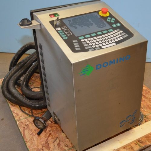 Domino Model DDC3 S/S Digital Laser Coder. sealed CO2 RF Excited Type Laser, Video User Interface with Intergrated Control Panel, Up to Two Lines Per Head, Up to 2,000 Characters Per Second (Single Line) or 4,000 Characters Per Second (Twin Line), Up to 3,300/6,600 Charcters Per Second with LEEP Laser Tubes, 820 Feet Per Minute Line Speed or 1,310 Feet Per Minute with LEEP Lasers, 5x5, 7x5, 7x9, PC Font, Arabic Font Print Formats, Up to 253 Characters Message Length, Air Cooled Laser head. 100-240 V, 60 Hz.