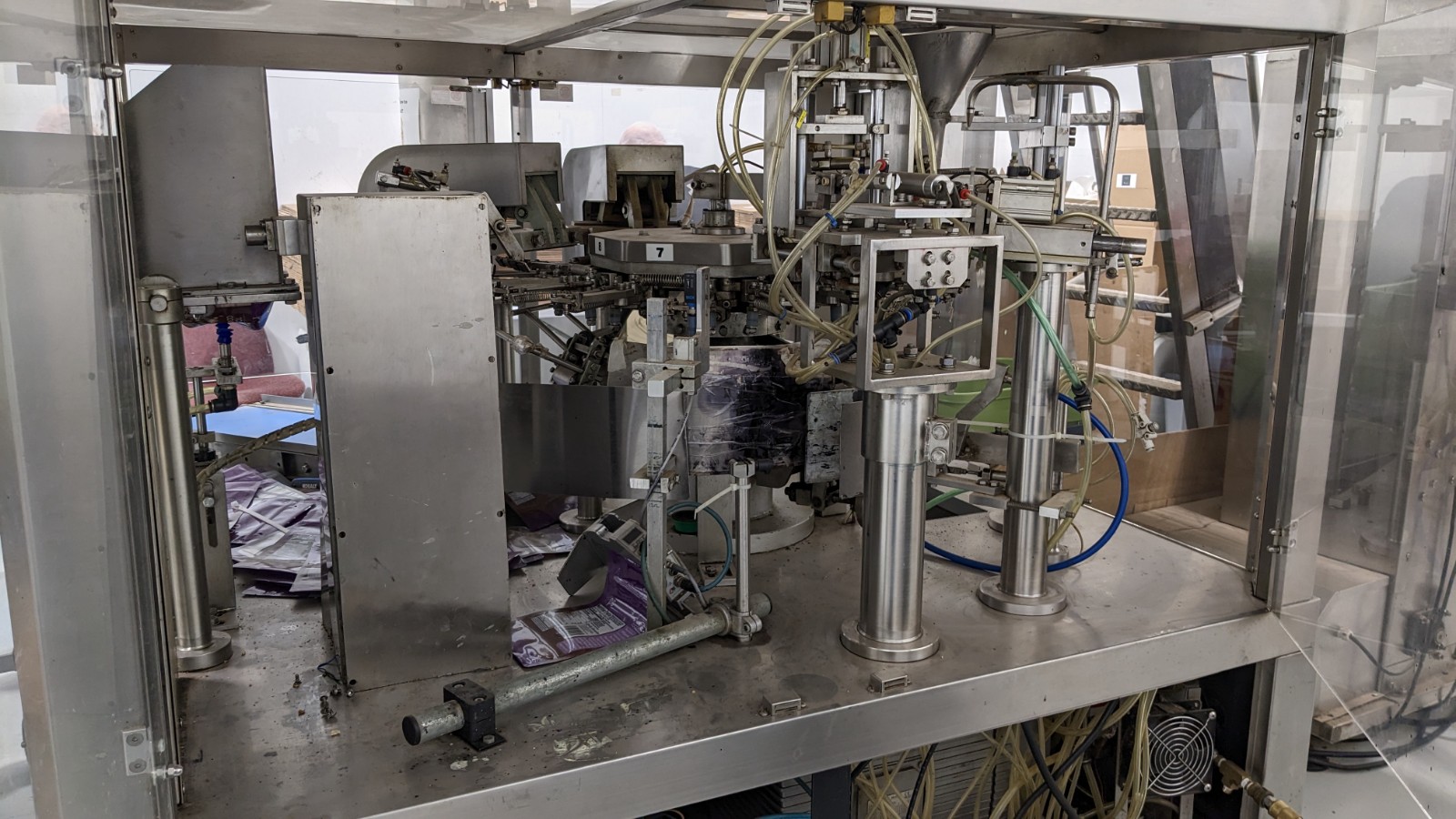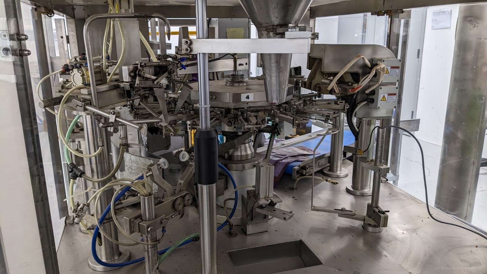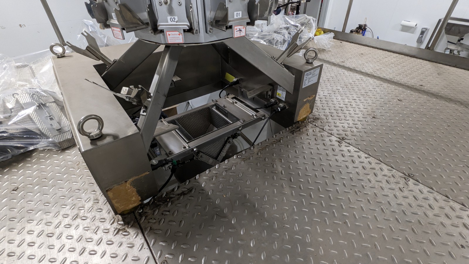 Excel Rotary Premade Pouch Filling and Sealing System Including: Excel Model E300 Premade Pouch Filler and Sealer. Production Rate up to 35 BPM, Fill Volume 34oz or 2 Pounds, Bag Width 100-200mm, Bag Length 100-300mm. Excel Model UW10D (10) Head S/S Rotary Combination Scale. Excel Model ZET183 Z-Shaped Bucket Elevator.