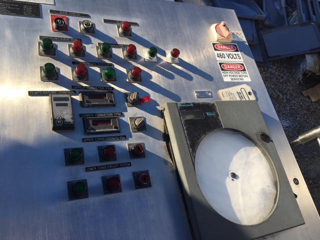 FooDesign Immerso-Cook model IMC3616SDB S/S direct-fired fryer with double belt product configuration and steam vent demister. Belt is 36 in overall wide with 34 in useable width. The conveyor configuration consists of top (submerger) and bottom belt conveyor which utilizes flat flex wire belt. In order to provide versatility for a variety of products the two belts are driven by separate drives. Actual frying area is 12 ft 6 in long and overall tank length is 16 ft L. Heat transfer is by means of a single serpentine tube. The single tube burner is a high-efficiency (80-85%), low NOX industrial burner with high heat capacity and quick response. The burner used in FOODesign fryers provides a substantial energy savings of 35% when compared to competitor’s units. Fryer is all stainless steel construction including hood, side panels, frame, tank and conveyor. Hood and conveyor are lifted by powered linear actuators driven from a single motor/reducer. The tank flat pan design includes one center sumps and oil return manifolds with piping to assist in moving fines to the strainer, using the circulation pump. Production may vary depending on customers actual values and final product. Electrical requirements are 460 Volts, 3 phase, 60 HZ, 60 amps. Natural gas requirements are and 1.8 million BTUs at 54 in water column. Other features included in the Immerso-Cook unit are: All stainless steel construction for ease of cleaning. Heavy duty tank design utilizes 3/16 in thick material with large tubular supports. Hood and conveyors are raised from synchronized electric lift actuators using a single drive. Proven design with additional lift height (30 in) for easier access to fryer tank and conveyors. Lift motor, shaft bearings and couplings are supplied in stainless steel. Drive reducer is supplied in white food grade epoxy paint or stainless paint finish and the bevel gear reducers are supplied in aluminum finish. Hood CIP system with quick release connection and hose. (Customer to supply pump for CIP system or use the system circulation pump). Single immersion tube with small diameter design facilitates use of optional filter system since it provides more open area than older style multi-tube fryers. Single tube design reduces oil volume in tank, thereby increasing oil turnover. The single tube design utilizes a high-efficiency, sealed burner. Operating costs are less compared to older style multi-tube units and because of the high efficiency burner, fuel costs are also less. Burner is provided with automatic ignition. The single tube burner is virtually maintenance free when compared to older multi-tube systems. The combination of sealed burner, fryer frame construction and hood construction transmits less heat to the room then conventional multiple tube fryers or water fall type fryers. Heavy duty conveyor frame design using laser cut 1/4 in thick plate material for conveyor frames. The paddle and various belts are driven from a single motor/reducer. The submerger and discharge belts are flat flex stainless steel belting with 36 in overall belt width. The conveyor is variable speed and the AC frequency drive is mounted in fryer control panel. Drives are located on the fryer inlet side. The main combustion and gas train components are mounted on stainless steel combustion skid. Gas train components include main and blocking valve, pilot valve, gas regulator, combustion blower, airflow switch, high/low gas pressure switch, powered butterfly valve and proportioning valve. Gas train is designed to FM standards. All components are easily accessible. Control panel is wall mounted, stainless steel, NEMA 4X with start/stop buttons, relay logic, high limit controller, flame safety controller, frequency drives, etc. Control panel is UL listed as UL 508 control panel. Ignition transformer NEMA 4X electrical box mounted on the fryer. All sensors are pre-wired to the junction box using PVC-coated rigid conduit and seal tight flexible conduit. Automatic oil level control and safety shut down level sensor are included. Units are pre-wired to junction box. Level sensors are located for easy sanitation and inspection. Fryer steam vent oil demister system with higher efficiency demister material. Removes oil captured in steam by means of a passive stainless steel filter. The demister material is a combination of stainless steel and Teflon material. Includes stainless steel frame welded to fryer frame, stack extension, hinged access door with clamps, two removable filters and additional controls for the exhaust blower. (2) Hot oil circulating pumps OP-250. Includes a pump specifically selected and designed for hot oil applications, wash down duty AC motor, stainless steel pump stand, piping and additional controls. The circulating pump increases heat transfer between oil and immersion tubes and is also needed for hot oil filter system. Pump setup includes oil manifold and manual stainless steel ball valves. Oil holding (storage) tank model OT-550. Tank is all stainless steel construction with tubular legs, top dished cover, sanitary connections, conical bottom, analog level sensor and high limit sensor. Tank useable capacity is 495 gallons and overall capacity is 550 gallons. Tank should provide sufficient capacity to hold fryer oil volume and oil volume for 16 hours production. It is recommended that the cooking oil be stored in oil holding tank after production. In addition the oil is stored in the tank when the fryer is being cleaned. Oil transfer pump/powered valve for transferring oil from oil holding tank to fryer. Includes high-temperature OP-75 pump for hot oil transfer, pump skid, powered valve and additional controls installed in the fryer control panel. The oil transfer pump is used to transfer oil from the oil storage tank to the fryer. It is also used to transfer oil automatically to the fryer in order to maintain proper oil level for cooking