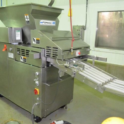 Formax Model F400 S/S Patty Former. The PLC controlled F400 combines the latest technology with a generous 15 3/4in (400mm) mold plate width. Its hydraulic compression system promises reliability and precise portion control with each filling cycle. Independent of the hydraulic forming system, the F-400 mold plate drive is capable of speeds up to 70 strokes per minute. This mid-sized machine is compatible with all Formax filling and tooling systems, providing unlimited new product opportunities. with 18 in wide S/S Mesh Outfeed Conveyor, 32 in x 56 in S/S Infeed Hopper, GE Fanuc Push Button Digital Display. Including many spare parts and change parts some unused on approximately 6 Pallets.