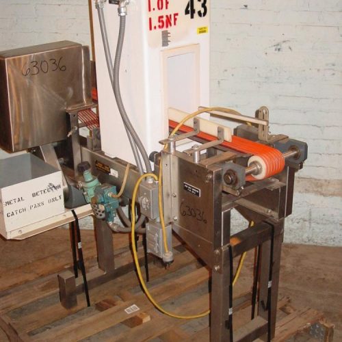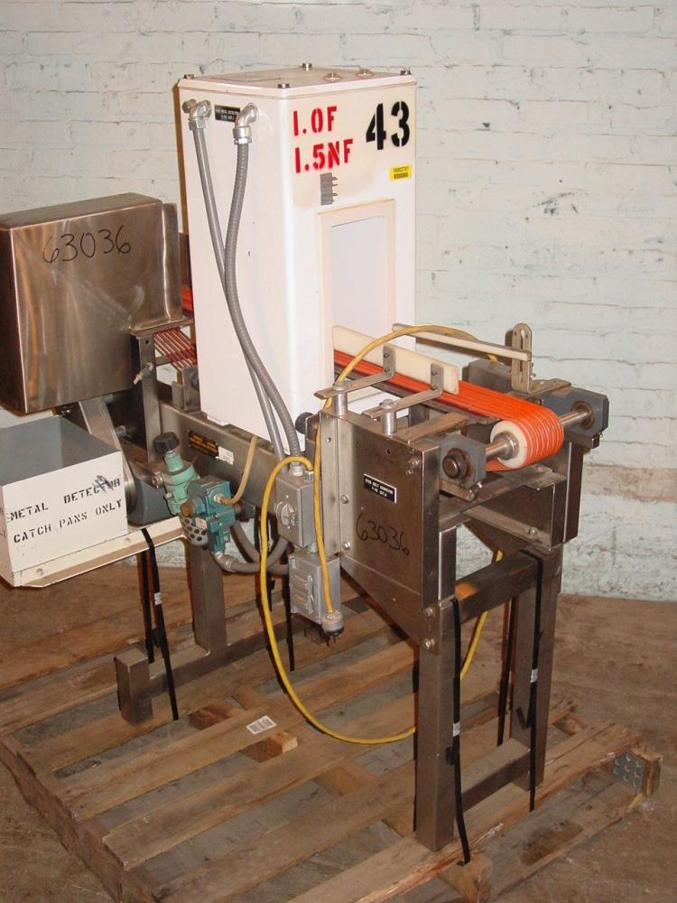 Goring Kerr Tektamet 5 x 12 Metal Detector w/ Conveyor, Opening w/ Conveyor 5 in W x 9 1/2 in H, 300khz, Kamflex S/S frame MDl 525 S/N S6391 60 FPM (7) stran rubber tube conveyor 45 in L w/ 1/3 HP single phase 115 Volt drive, Air jet reject w/ catch bin