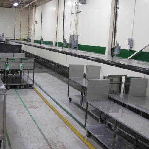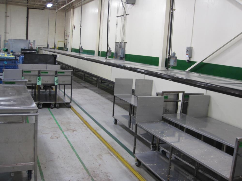 Haas 41 in Wide x approx 108 ft Long Straight Line Cooling Tunnel with Plastic Interlocking Delrin Conveyor. 1 3/4 in H Clearance in Opening From Top of Belt. Estimated Belt Speed 16 FPM, (6) In-Line Evaporator Fan Sections with 5 Fans Each. S/S Frame and Legs.