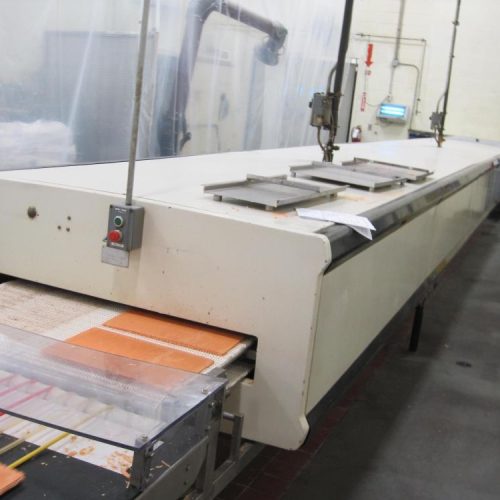Haas 41 in Wide x approx 116 ft Long Straight Line Cooling Tunnel with Plastic Interlocking Delrin Conveyor. 1 3/4 in H Clearance in Opening From Top of Belt. Estimated Belt Speed 16 FPM, (6) In-Line Evaporator Fan Sections with 5 Fans Each. S/S Frame and Legs.