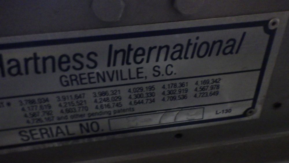 Hartness Model 825AT Drop Case Packer with Gang Infeed. Speeds up to 20 CPM. Compatible with Many Container Types Including Glass, Plastic, Cans in Sizes From 2 oz to 2.5 Gallons. Case Size Range: 6 in to 24 in Length. 6 in to 16 in Width. 1-1/2 in to 6 in Height. Lowering Head. Air Transfer System. Anti-Toppling Device. Down Container Detector. 480 V, 3 Ph, 60 Hz.