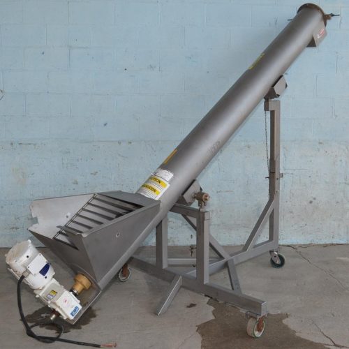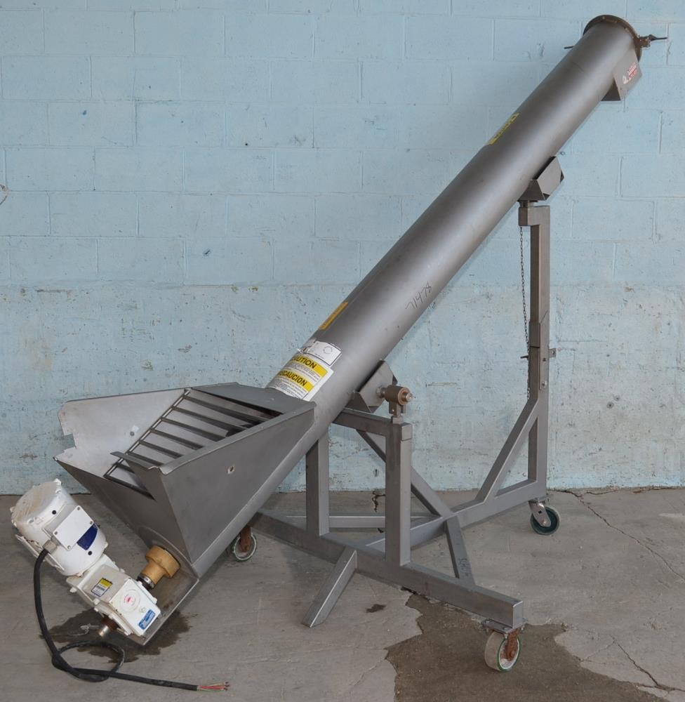 Hawkeye Food Machinery 9 in Diameter x 114 in Long Portable S/S Incline Screw Conveyor. 9 in Diameter x 114 in L S/S Screw, 3 in Diameter Shaft, 9.5 in x 8 in Discharge Port, Approx 74 in Discharge Height. Mounted on S/S Frame with Casters. 230 V, 3 Ph, 60 Hz, 1 HP, 3450 RPM, 3.6/1.6 Amp, Gearbox Ratio 100:1, TENV.