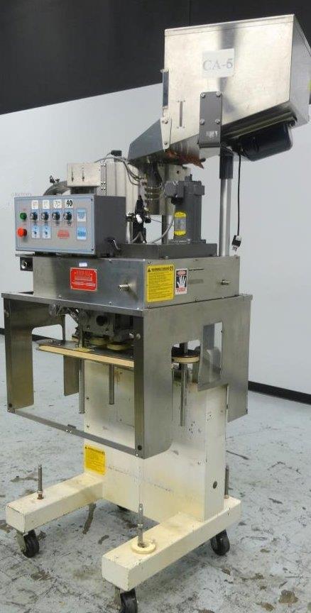 Kaps All Model E4 Portable Spindle Capper. Machine has 4-rotary spindles for speeds up to 80 containers per minute (depending on container and cap size). Has a size range varying from vials up to 2-1/2 gallon containers. Hand crank size adjustments. Has cap hopper and top-mounted sorting bowl. 1/60/110V.