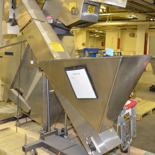Kaps All Model FSB Portable S/S Incline Cap Elevator, 8 ft L x 8 in W Vinyl Flighted Conveyor Belt, 8 in on Center, 1 1/2 in H Flights, 65 in Discharge Height, 37 in L x 20 in W x 31 in D S/S Feed Hopper, Mounted on C/S Frame