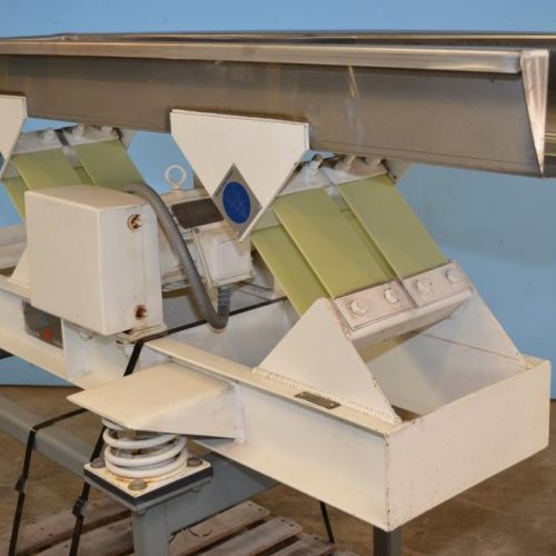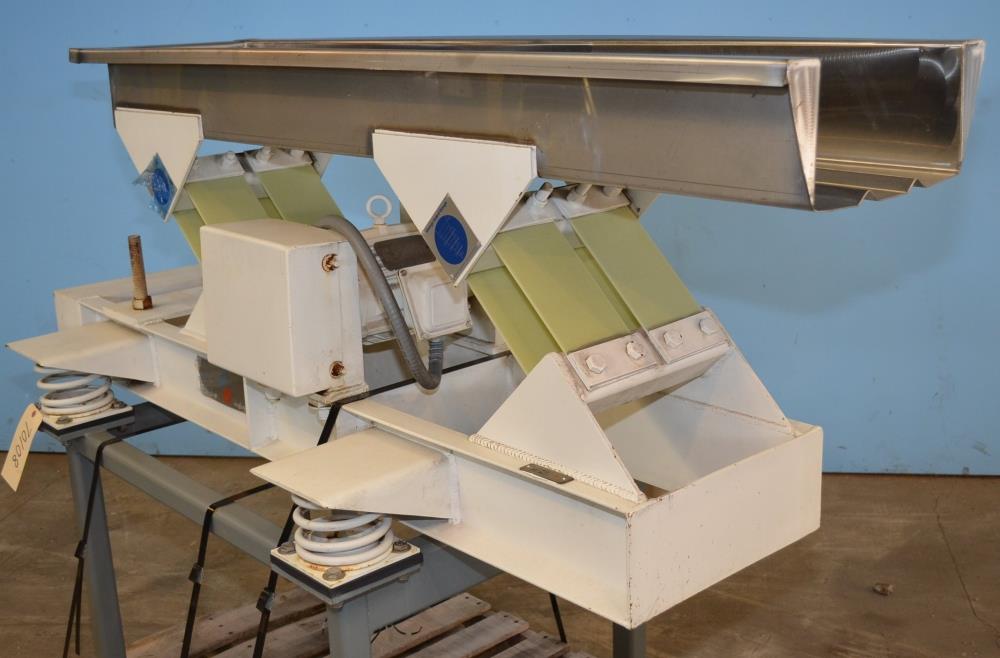 Kinergy Model KDC12FG 12 in W x 62 in L x 6 in D S/S Vibtarory Pan Conveyor. 48 in Discharge Height, 1/4 HP Drive, Mounted on C/S Frame.